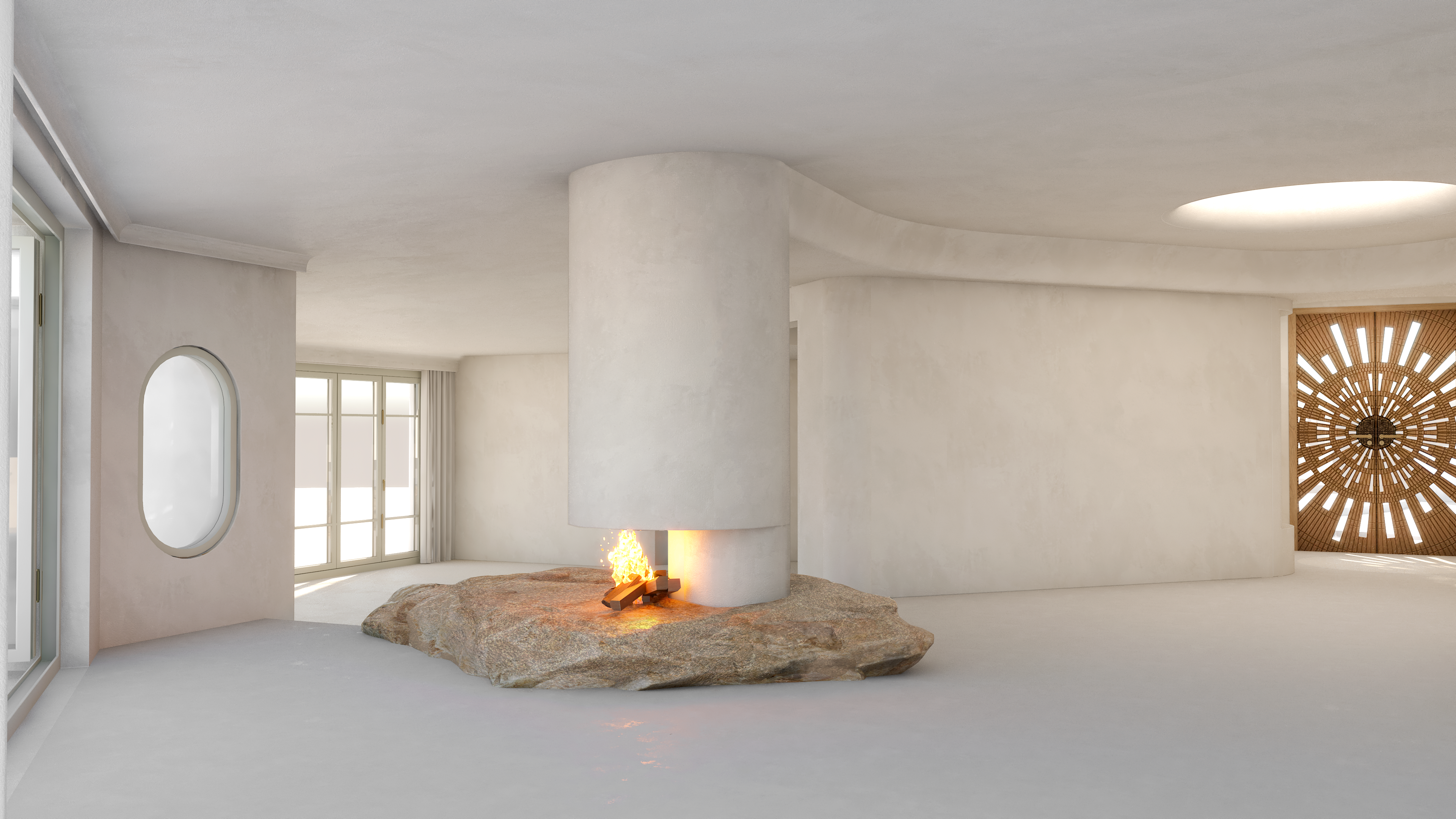 i have a wood burning fireplace for a house in sardinia that i need to design i m uploading the rendering i created and i d like you to alter the shape of the fireplace so it looks more like a seashell i d like to maintain the cylindrical style of the fireplace but make it look more organic architecture