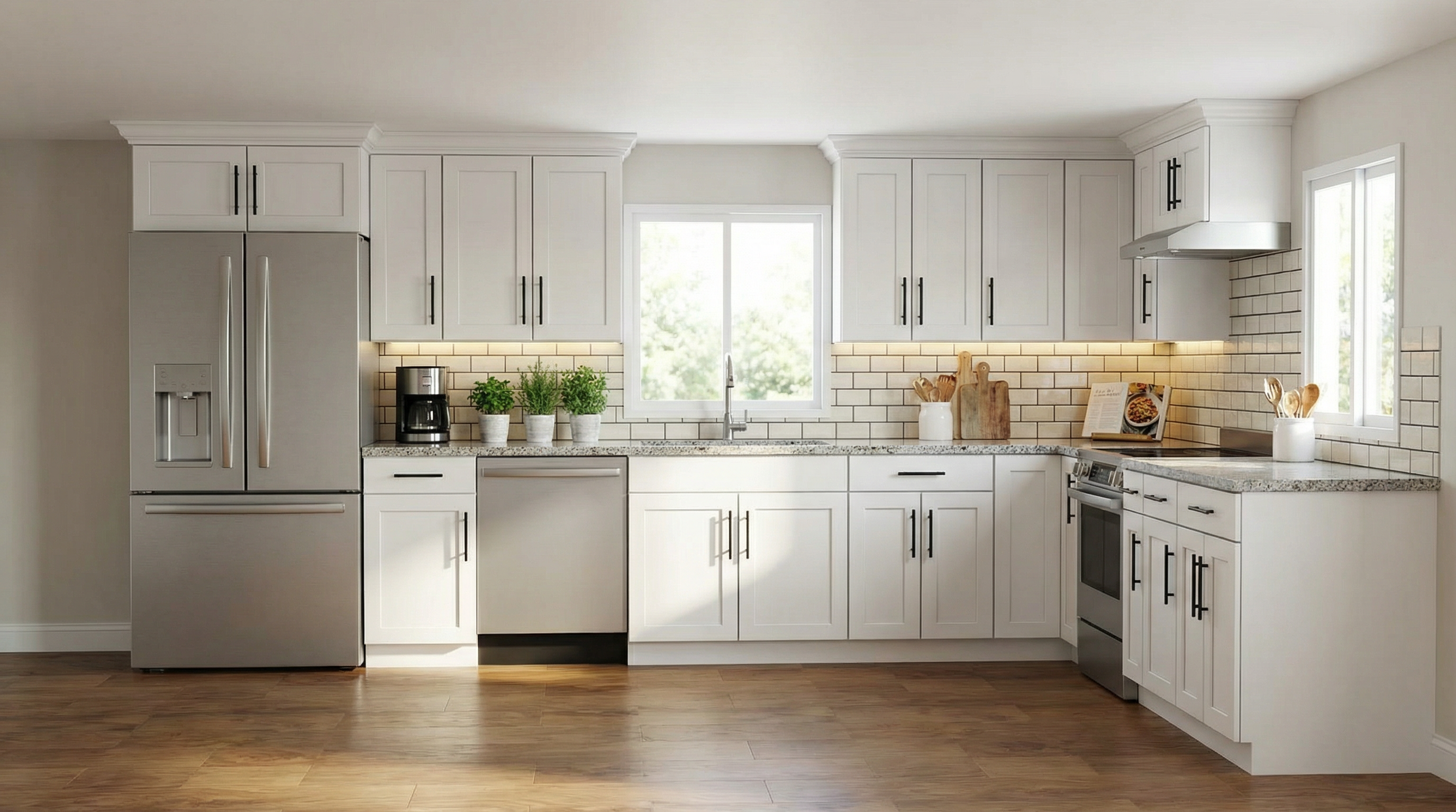 modify the existing 3d building render by increasing the front width from 25 ft to 34 ft while preserving the original architectural design fa ade composition roofline materials windows trims and entrance placement expand the building naturally and symmetrically without changing the style or distorting the geometry convert the existing garage door into a realistic double car garage door that fits proportionally within the widened fa ade add a variety of mature trees and natural landscaping around the building show a neighboring residential building on one side with approximately 3 feet of spacing from the main building integrated naturally into the scene keep the same camera angle lighting shadows perspective and photorealistic architectural rendering quality preserve architectural realism suitable for a professional residential design presentation the timing is on the afternoon and sharp sun