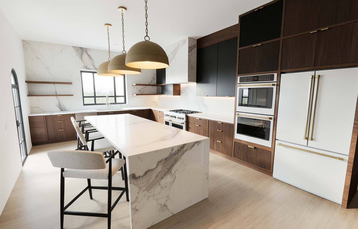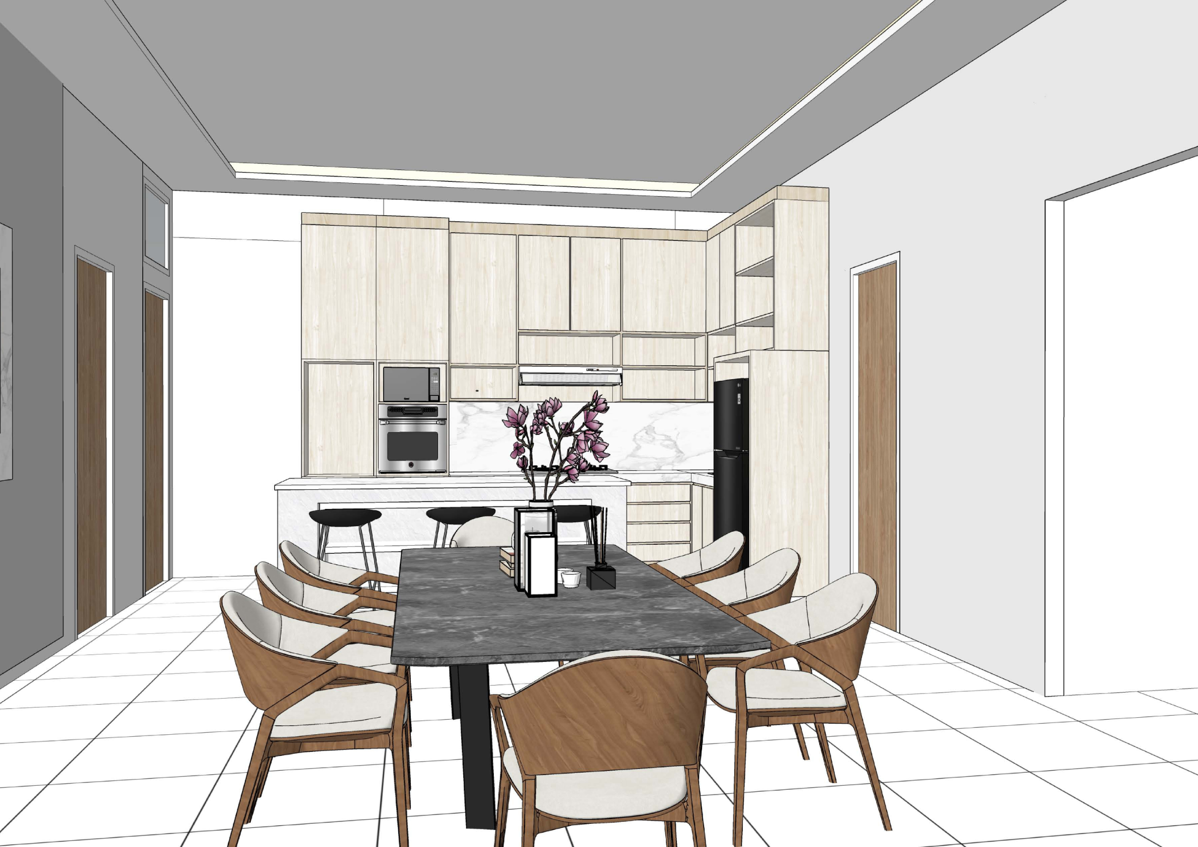 realistic architectural interior render of a modern minimalist space of a house keep the exact original layout proportions furniture placement materials and camera angle no redesign no added or removed elements clean contemporary aesthetic with soft neutral color palette natural daylight entering from large sliding glass doors with sheer curtains soft diffused sunlight realistic shadows warm indirect cove ceiling lighting subtle led strip glow balanced exposure real life material textures physically accurate materials pbr textures correct reflections subtle glossiness variation soft ambient occlusion global illumination ray traced lighting realistic camera lens 35mm eye level perspective correct scale and depth clean styling minimal clutter photorealistic interior photography high dynamic range sharp details natural color grading architectural digest style 3 of the door in the image two on the left 1 on the right are all wooden door keep them closed