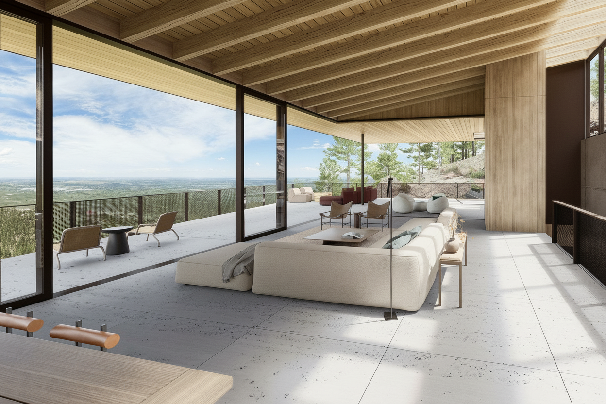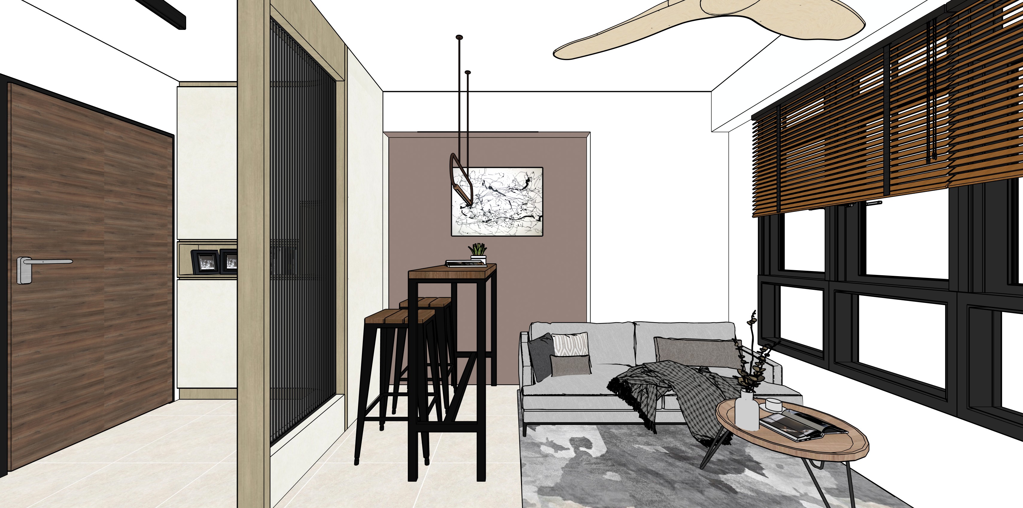 add in warm led lighting to the top of niche glass is fluted with black frame cabinet doors are light beige microcement color add in warm light to the ceiling fan add in warm led lighting to the pendant light behind the glass allow some natural lighting to flow in from the window floor tiles are semi gloss beige in colour there are no led lights at the top of the cabinet and the wall behind the dining table there us also no led lighting above the fluted glass
