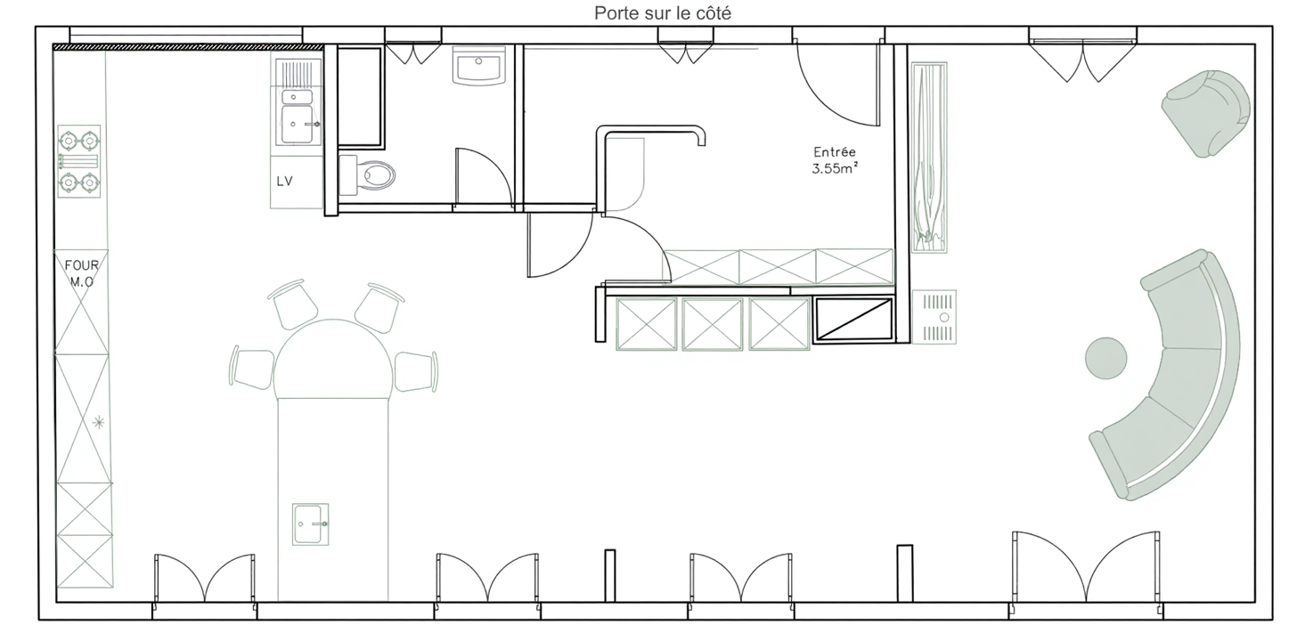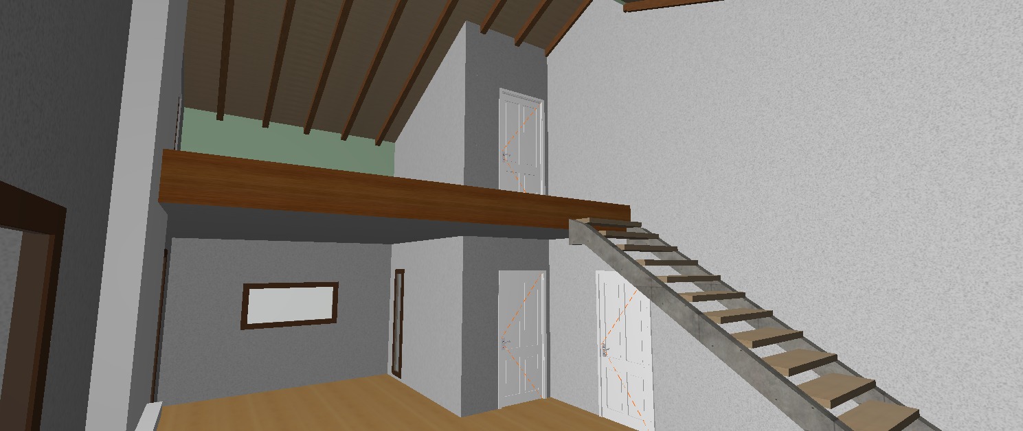 cozy modern wooden house interior with natural materials view from the living room toward the kitchen and staircase visible wooden roof beams with white stucco between the beams warm oak wood floor and natural tones throughout the space under a horizontal window there is a linear kitchen with wooden cabinets and light stone countertop with a kitchen island in front of it in the foreground a comfortable living room with a sofa coffee table and natural textures many natural details such as indoor plants flowers and wooden decor elements to create a warm atmosphere modern wooden staircase with a simple elegant railing the upper floor is an open gallery used as a home office workspace with desk and shelves also with a minimal wooden railing overlooking the living room soft natural daylight entering through the windows warm ambient lighting scandinavian modern alpine interior style photorealistic cozy atmosphere natural materials architectural visualization