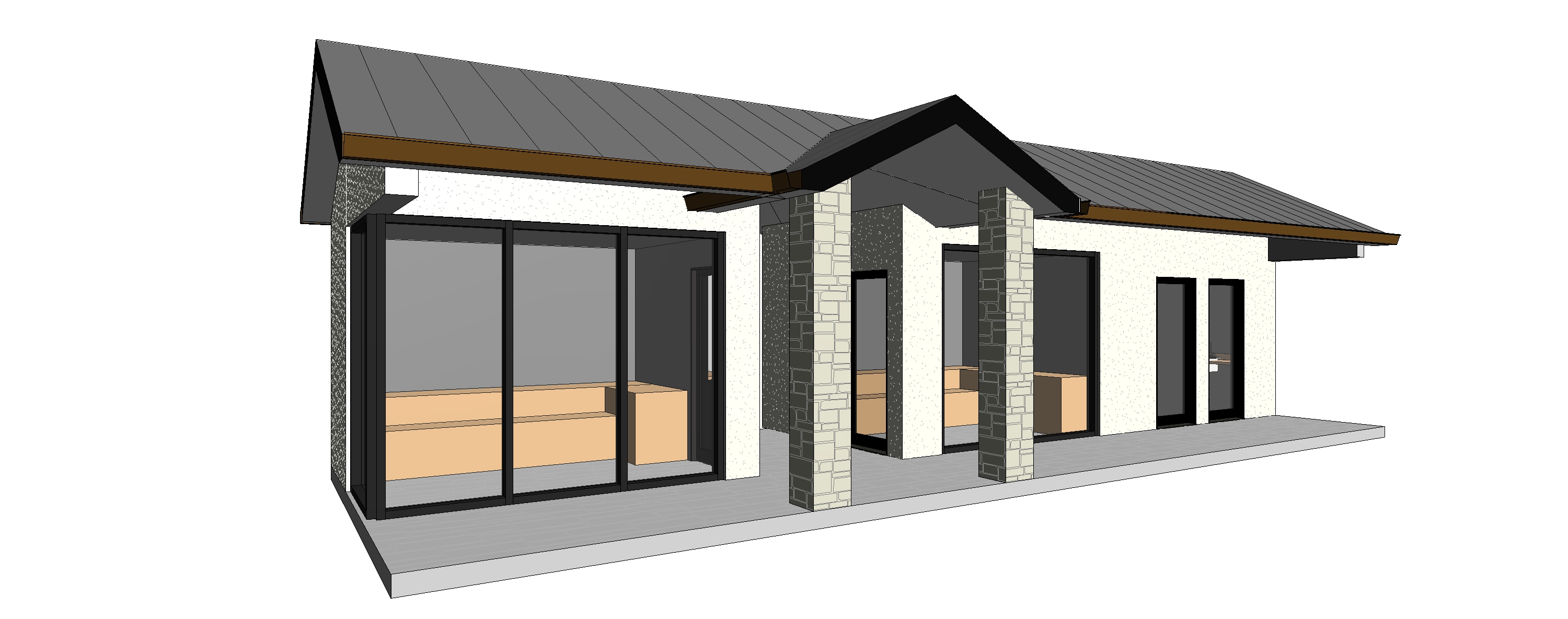more natural outdoor lighting black door and window frames black standing seam roof stone marbel flooring under eave wood finish light brown stucco walls black fascias