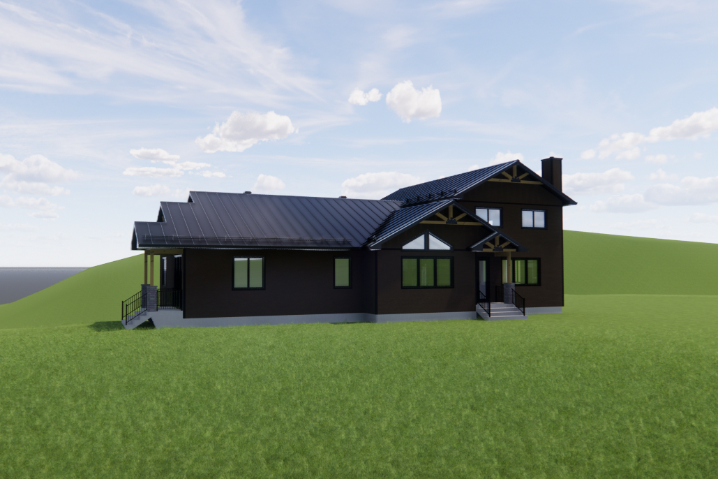 ultra realistic 4k render house in a forest in mont tremblant summer at midday black wooden cladding include a family sitting around the fire