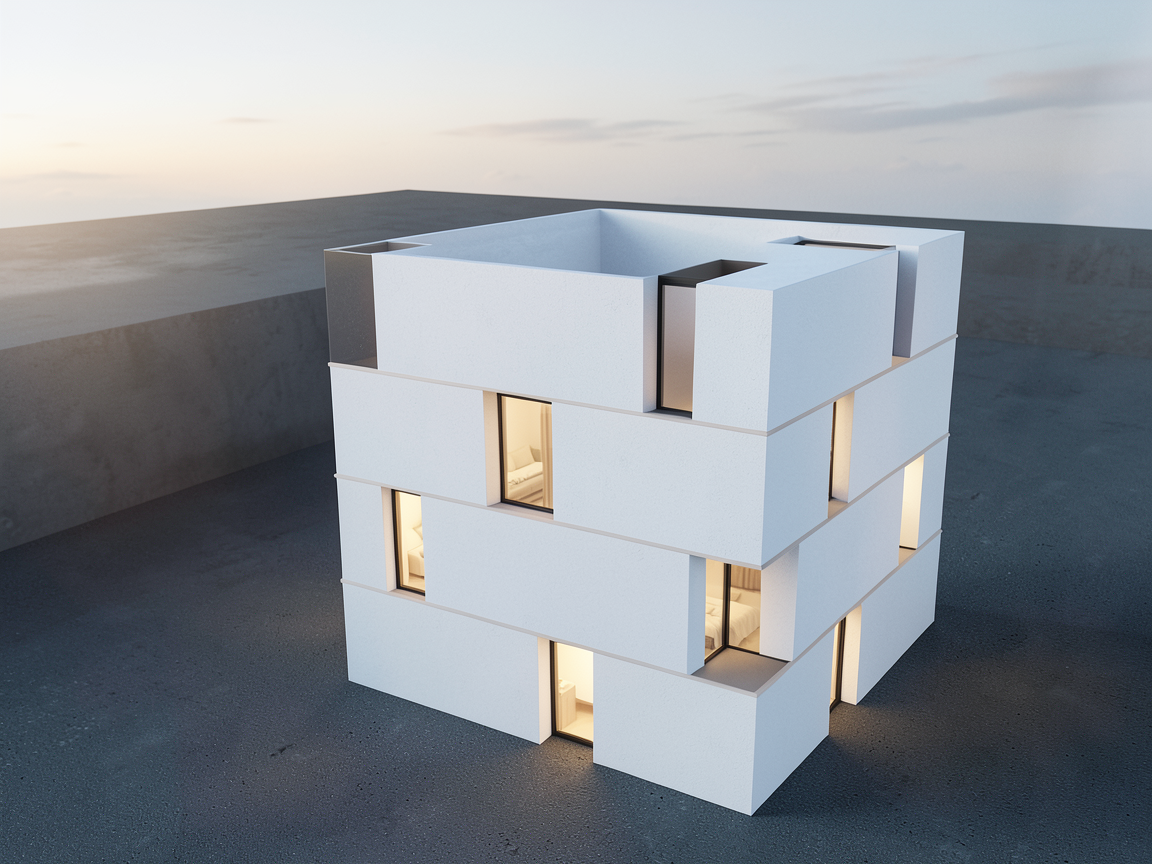transform the uploaded image into a modern building treat the blue colored areas as windows with soft and subtle interior lighting glowing from within design the facade in white toned colors with a modest but perceptible texture adding material depth without appearing luxurious or marble like while keeping the overall structure and scene consistent