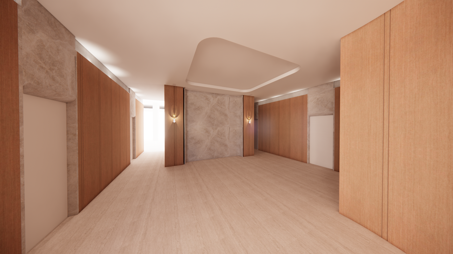 arno amenity elevator lobby prompt wood stone feature wall transform this space into a highly photorealistic luxury residential interior consistent with the arno building design language maintain the exact architecture layout and proportions do not alter geometry or add new architectural elements flooring locked across project use porcelanosa taranto bianco large format porcelain tile matte finish with soft light diffusion subtle tonal variation minimal grout lines no gloss or reflection elevator feature wall design primary focus use the second reference image to define the elevator wall composition and detailing create a rhythmic vertical panel system combining warm wood panels light stone vertical elements wood panels rift sawn white oak soft neutral tone no red orange vertical orientation matte finish clean flush panel joints stone elements light travertine look or porcelain aligned with taranto bianco palette used as vertical bands and soft curved transitions between panels subtle texture matte finish rounded or eased edges where shown in reference key detail important incorporate soft curved or radiused transitions in the stone portions like the reference image keep this subtle and architectural not exaggerated lighting integration very important add concealed vertical lighting integrated between wood and stone panels lighting should emit a soft warm glow highlight the depth between materials gently wash the stone surfaces add subtle ceiling slot lighting or linear lights if already present in the model do not add new ceiling elements only enhance existing lighting overall aesthetic high end minimal and architectural balanced contrast between warm wood and light stone clean refined detailing with consistent spacing and rhythm no clutter or unnecessary styling critical constraints all materials must be matte finish no gloss do not introduce new materials outside of wood light stone porcelain keep tones consistent with arno lobby palette do not redesign layout or proportions