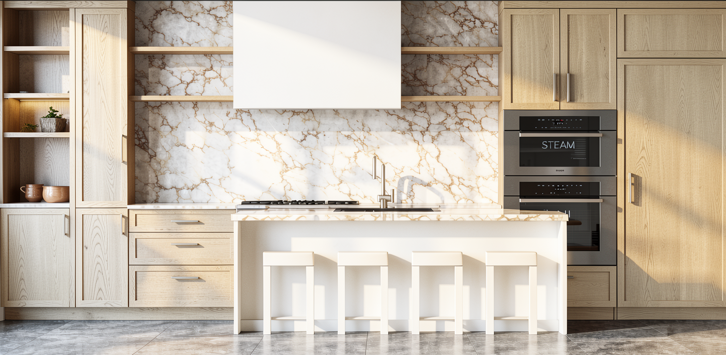 change wood to rift cut white oak with a lbrown natural matte finish make stone calacatta vagli polished