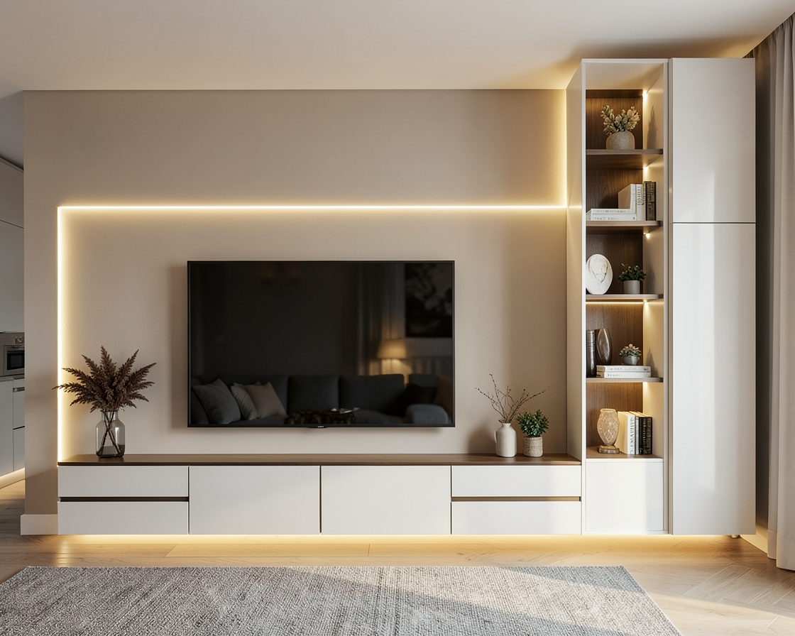 create ultra realistic images without changing any structure shape design or material do not resize the jpeg do not change the color of material add indirect light in every shelves