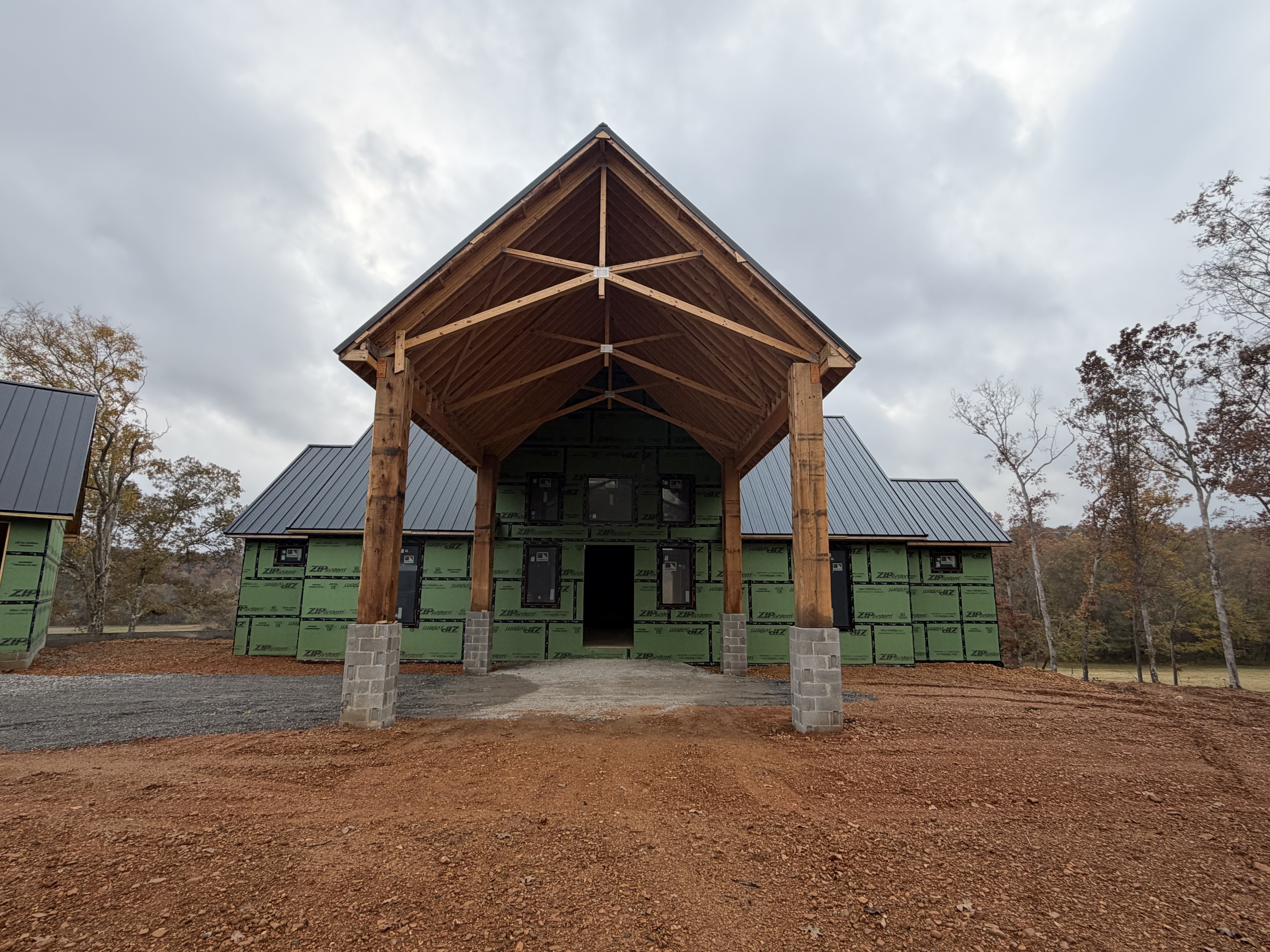 show gray barn wood siding above creek stone base with jeep in driveway and stamped concrete driveway with modern steel planters architecture