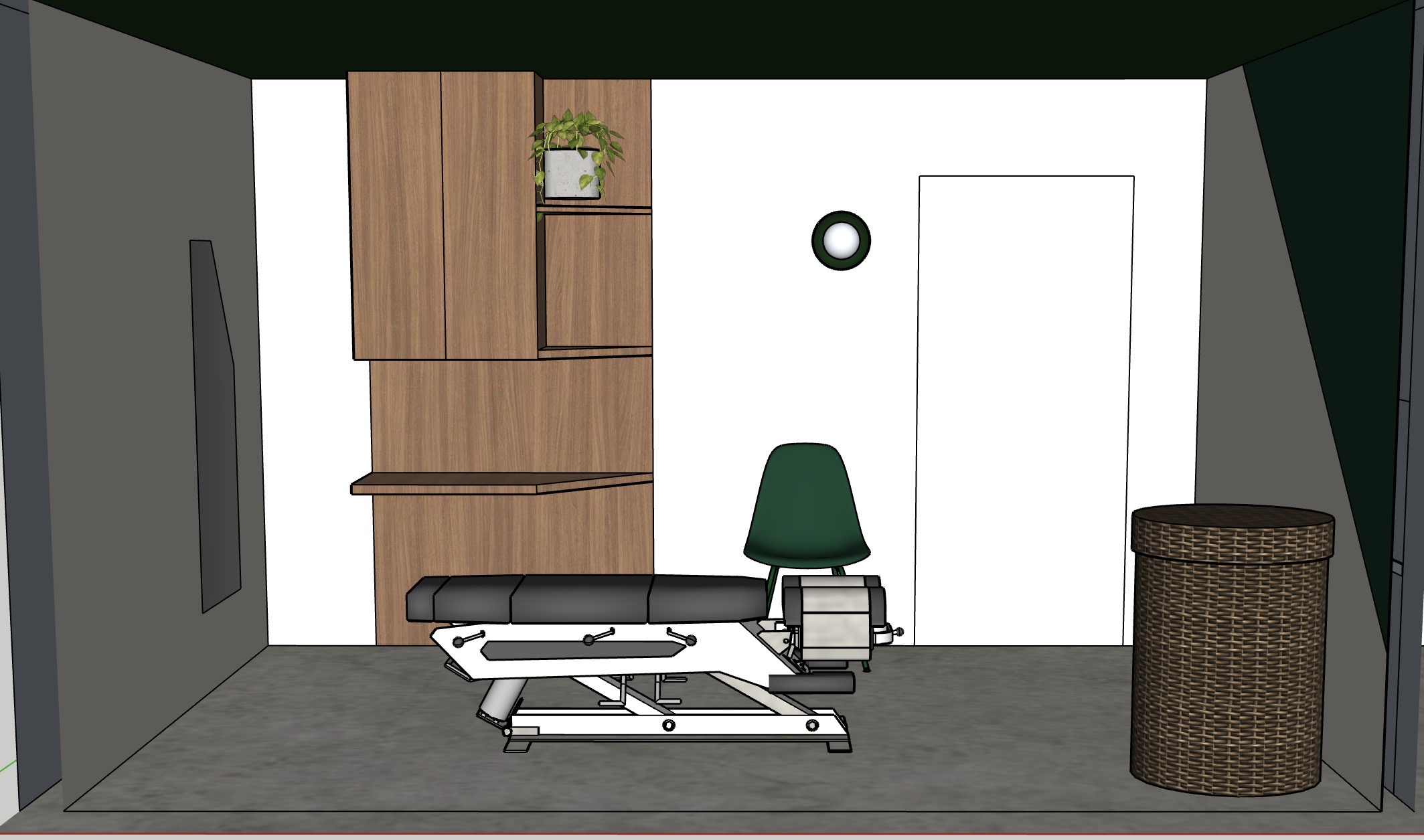 plaintext create a cozy modern interior scene the room features a dark green ceiling and accents contrasting with soft gray cream walls incorporate a sleek black chiropractic table with black padding as the focal point design wooden shelves in a rich walnut finish adding a small green potted plant for a touch of nature place a dark green modern chair as an accent piece include a textured cylindrical wicker basket beside the table blending natural and synthetic materials use muted tones with warm lighting to evoke a calm and tranquil atmosphere