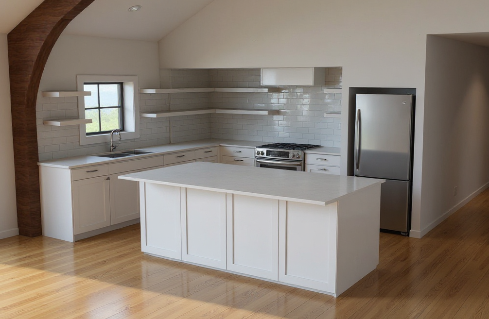 do not change anything from this image except making the range a wolf gr366 and the fridge a samsung side by side also replace the floating shelves above the counters on the left and right of the range with glass door upper cabinets keep the floating shleves left and right of the window but make them the same wood as the truss adjacent do not change anything else but what i have just said