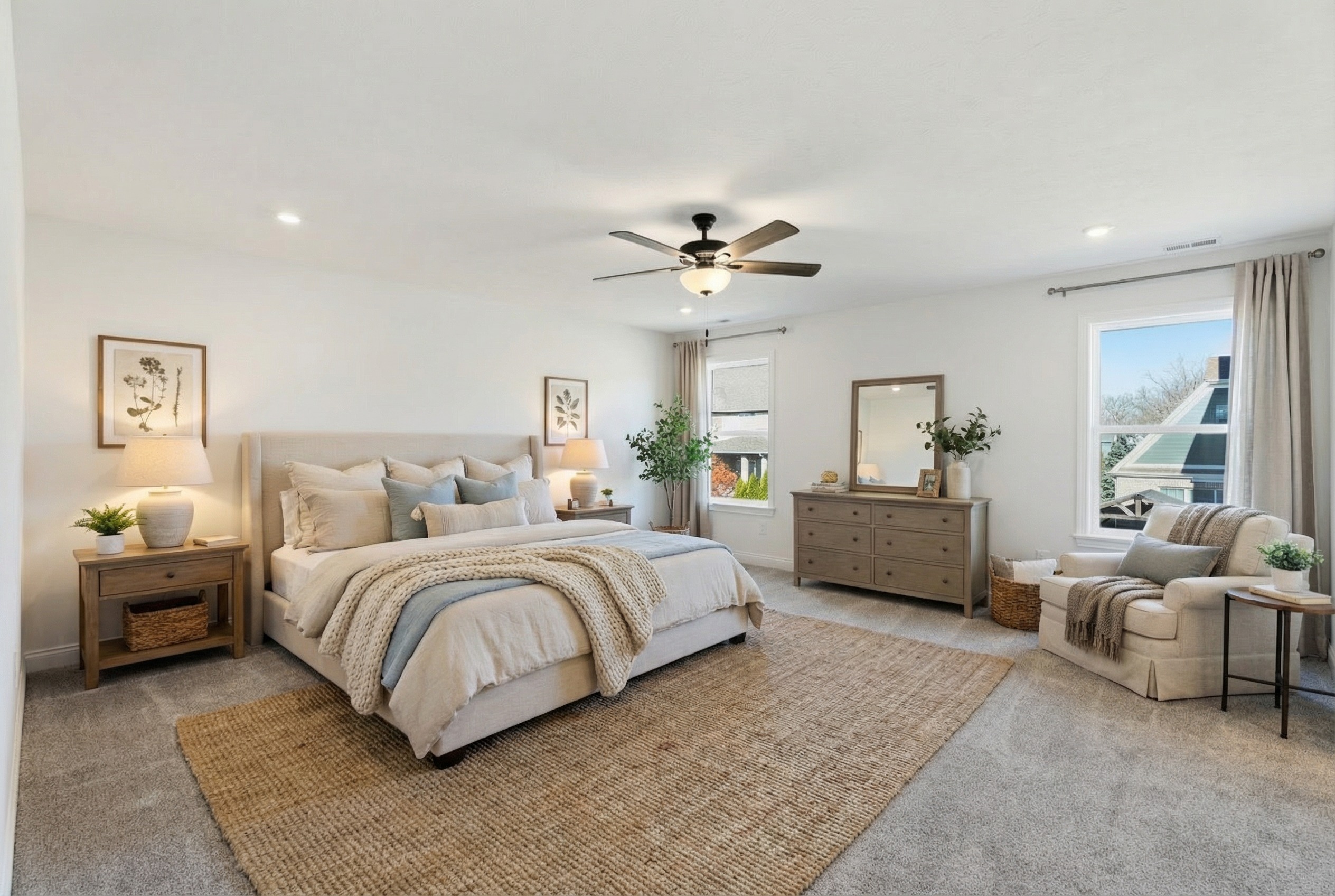 change the rug to a soft boho style with muted colors make the dresser a bit wider add another curtain on each side of the window so there are 4 panels total in the room