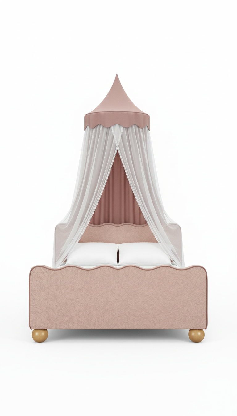 can you style this bed with this canopy above it the one in the reference photo don t change the perspective of the bed keep it straight on make the canopy top a dark rose color like in the reference photo with layers of tulle and pink fabric hanging down around the bed