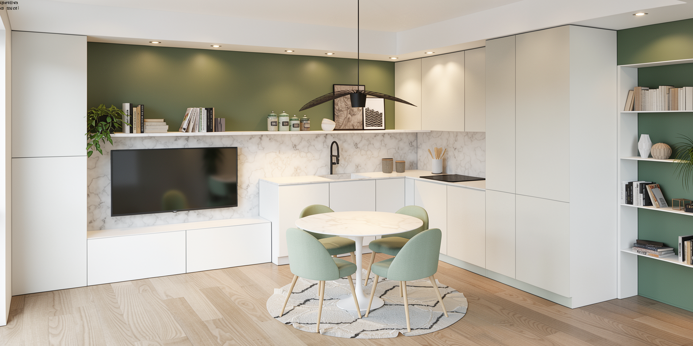 the ceiling is painted white the sofa has boucle fabric the table has white marble surface