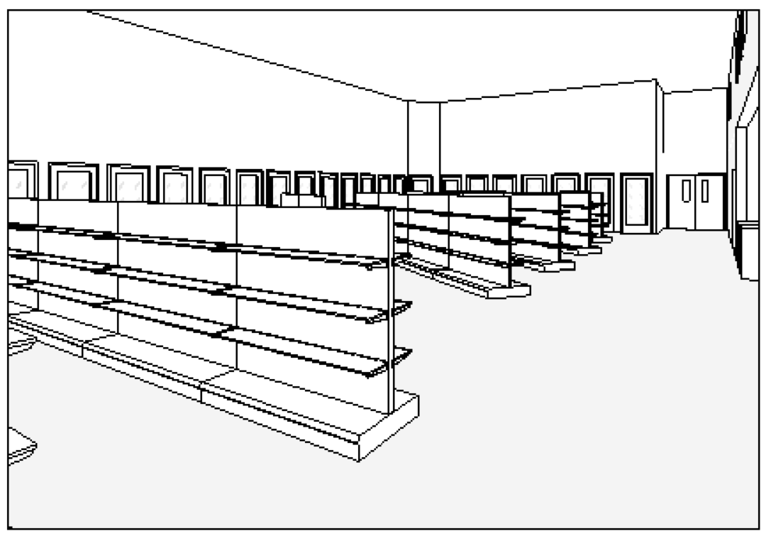 this is a liquor store with polished concrete floors exposed structure wayfinding and aisle signage neon beer signs on walls black shelving people shopping