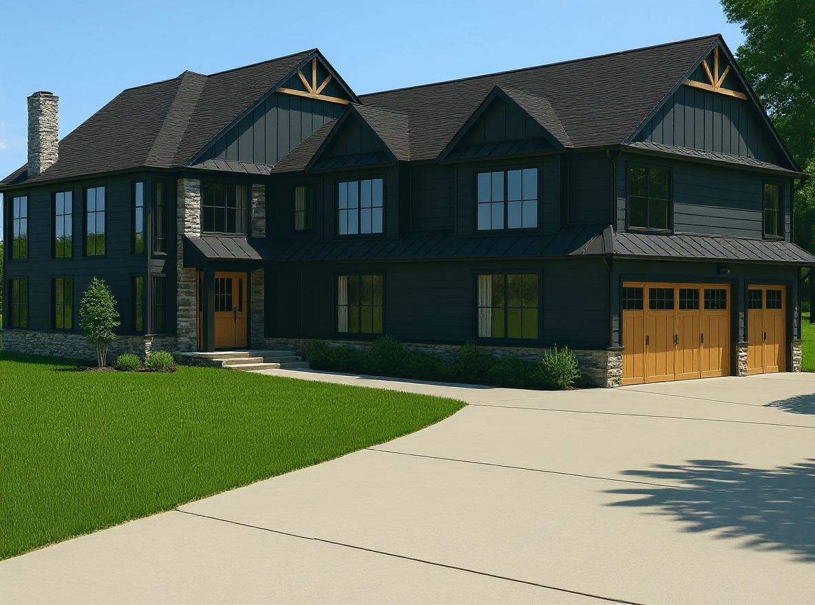 please make the large arched window in the front door into two parts with a break created in brick material same color as the rest of the home right above the double doors