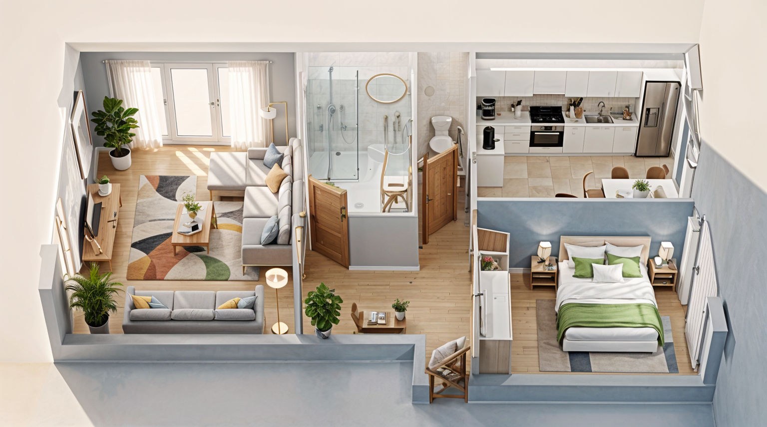 convert this floor plan into a realistic isometric 3d view of a full house show the space from an elevated angle with furniture walls and details visible concrete floor inox kitchen black chairs wooden tables use the same furniture as shows on the plan do not change the orientation of the floorplan