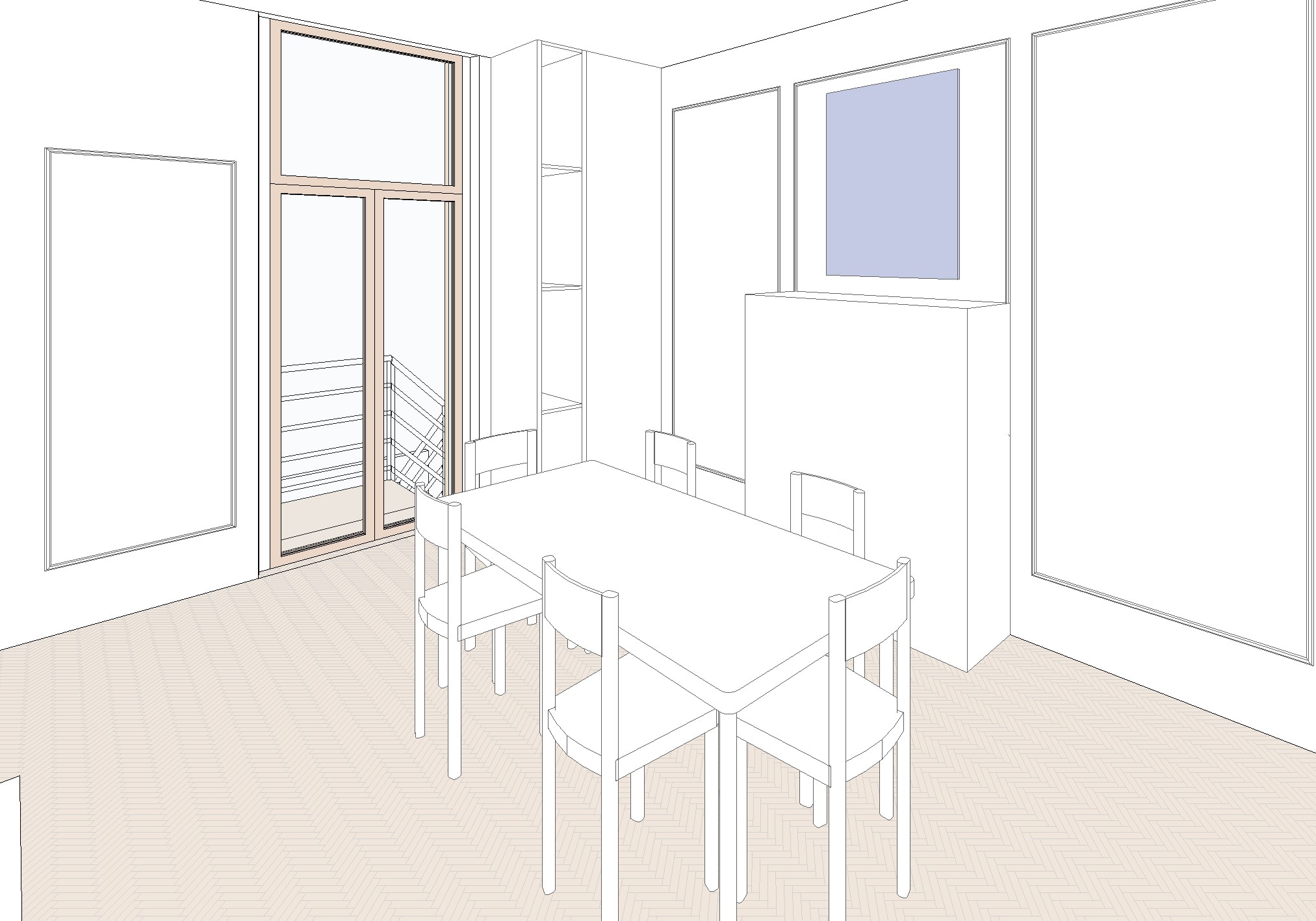 crea un render fotorealistico di questa vista 3d puoi cambiare la dimensione e forma delle sedie il tavolo sar color legno con delle forme morbide le sedie sono in stile classico in legno con imbottitura bianca il rettangolo azzurro un quadro mettici un opera d arte moderna con toni prevalenti sul blu e senza cornice il parallelepipedo sotto il quadro un mobile antico tipo cristalliera in legno e vetro anni 60 le pareti e le boiserie sono bianche il mobile vicino alla finestra beige il pavimento un parquet in noce americano a spina di pesce all italiana