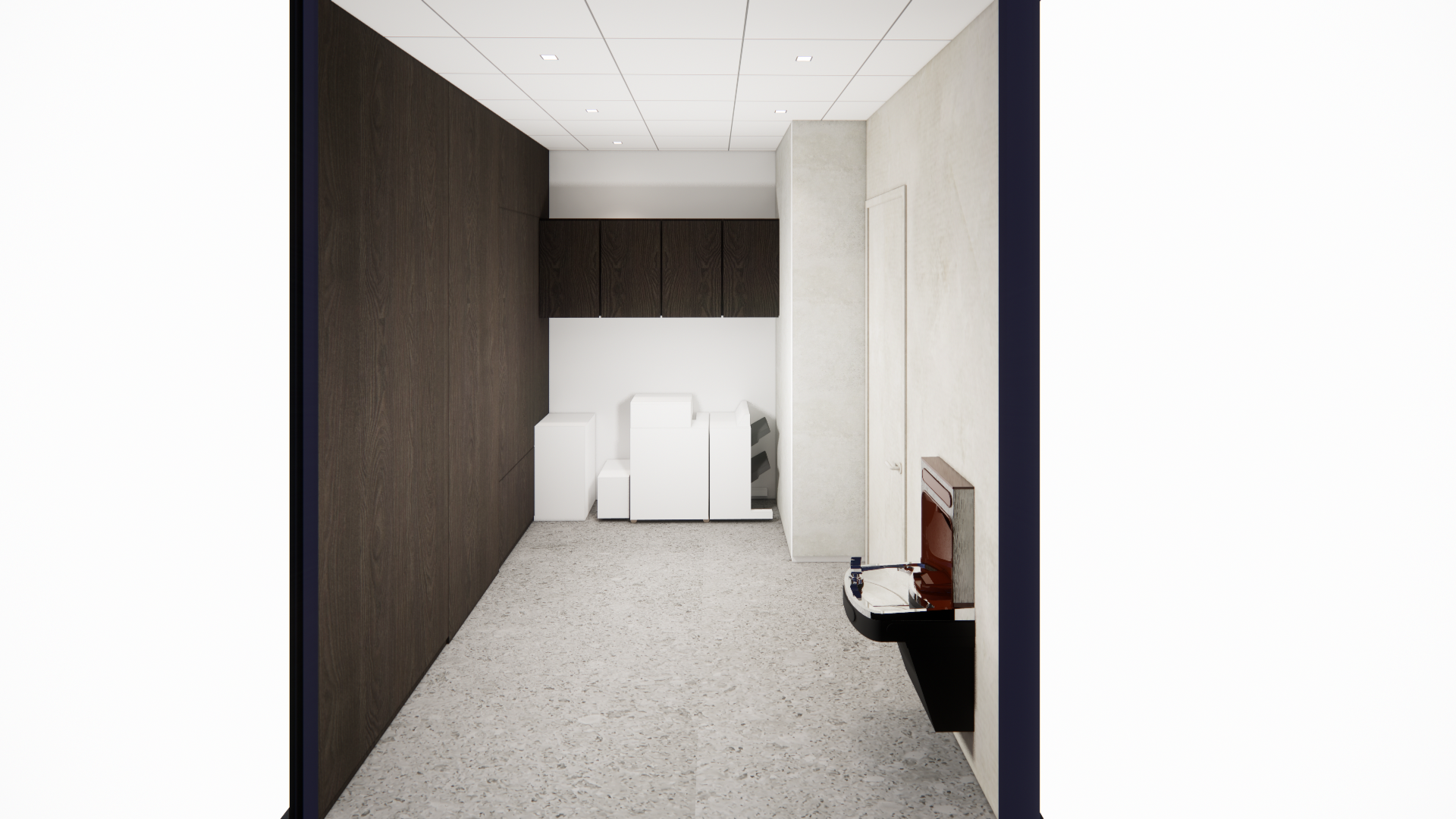 provide a photorealistic rendering keep all the elements proportions and materials as they are add a freestanding copy print machine in the background