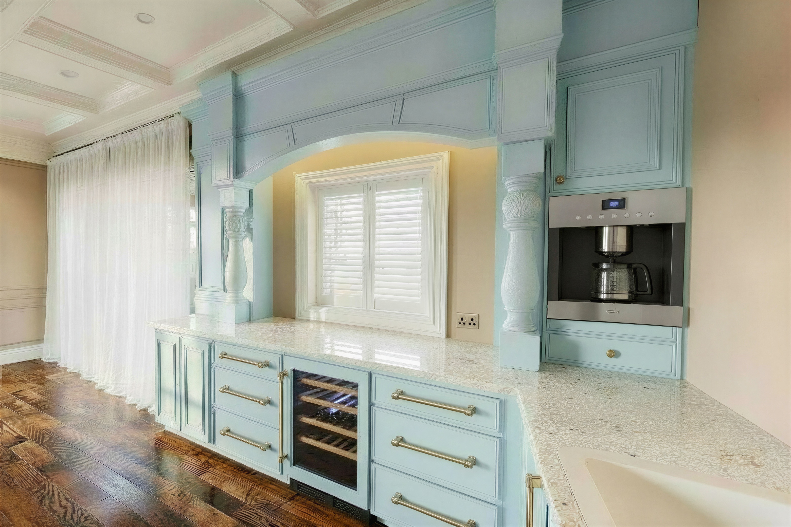 a beautifully rendered luxurious kitchen interior with pale blue painted cabinetry featuring intricate detailing and bronze hardware highlight the elegant arch and carved columns in soft sky blue use a polished granite countertop in soft white tones with specks of warm gray incorporate a sleek wine cooler showcase sliding glass doors with white louvers and with white frames allowing soft natural light to flood the room the walls are painted in a warm beige creating a cozy inviting atmosphere the floor is made of rich wooden planks in a blend of warm warm chocolate hues enhancing the room s warm and elegant ambiance