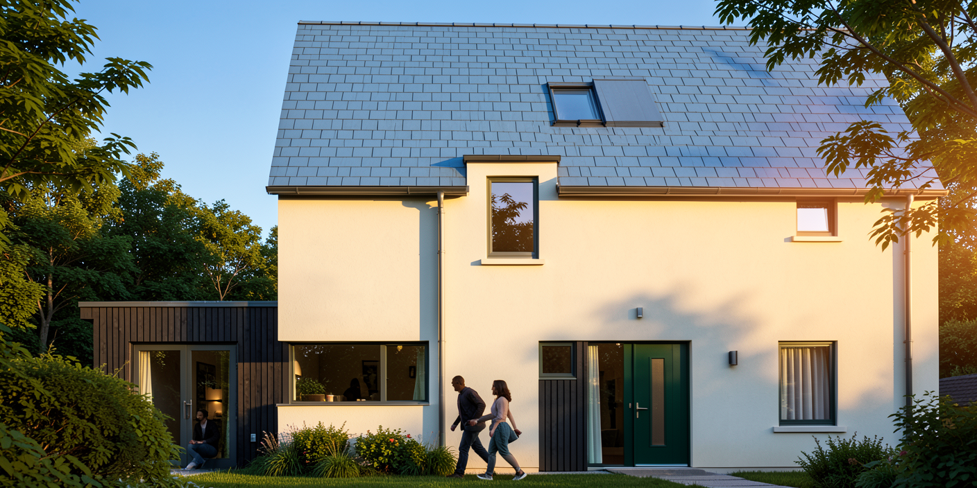 a charming modern house exterior surrounded by lush greenery the house features a soft cream facade with charcoal coloured wide plank charred larch vertical timber accents on the set back extension with double patio doors and recessed panel around a single front door the roof is a dark grey irish slate with a single velux rooflight large windows reflect the clear blue sky the front door is a welcoming deep forest green the atmosphere is serene and inviting with a warm golden sunset casting a soft glow over the scene two silhouettes walk past the house dressed casually adding a sense of life and movement
