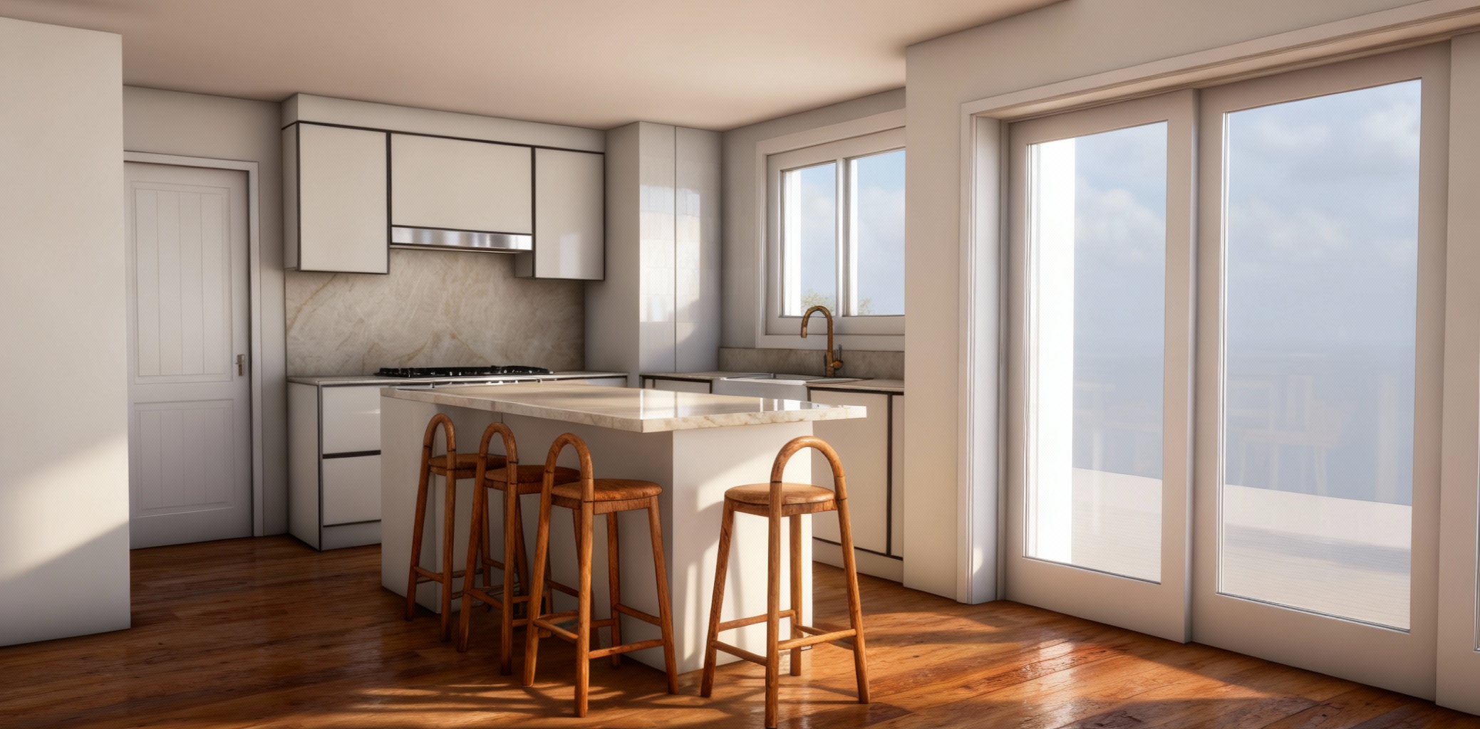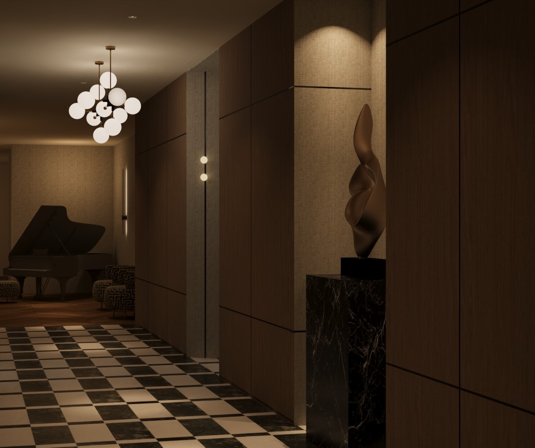 transform the provided corridor interior image into a high end photorealistic render with high end sophisticated moody lighting expressing luxury atmosphere while keeping everything exactly the same same proportions same ceiling same flooring pattern same wood color same black marble same furniture same soft materials scene description luxury residential hallway with dark wood wall panels neutral fabric textured wallpaper and minimalist modern decor floor is smooth cream toned concrete or stone ceiling mounted contemporary brass chandelier with frosted globe lights subtle built in spotlights in ceiling lighting soft warm ambient lighting 3000k 3500k with realistic global illumination and smooth soft shadows avoid harsh contrast blown highlights or crushed blacks light should gently wash over surfaces with subtle gradients material details important keep all elements exactly the same as in the image same camera angle furniture panel layout sculpture textures shadows wall materials and lighting mood style quiet luxury editorial photography style high end finish no people no clutter no extra d cor this is a precision edit request do not redesign or reposition anything
