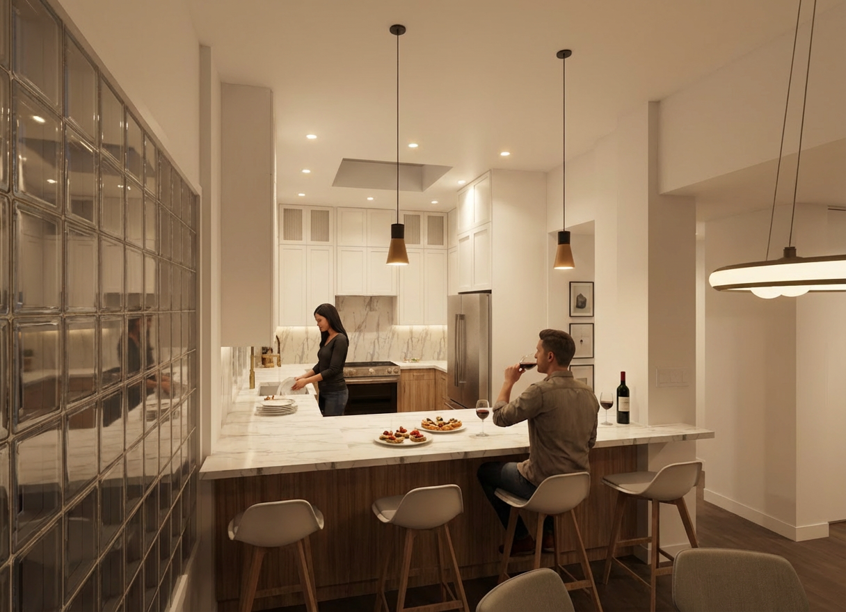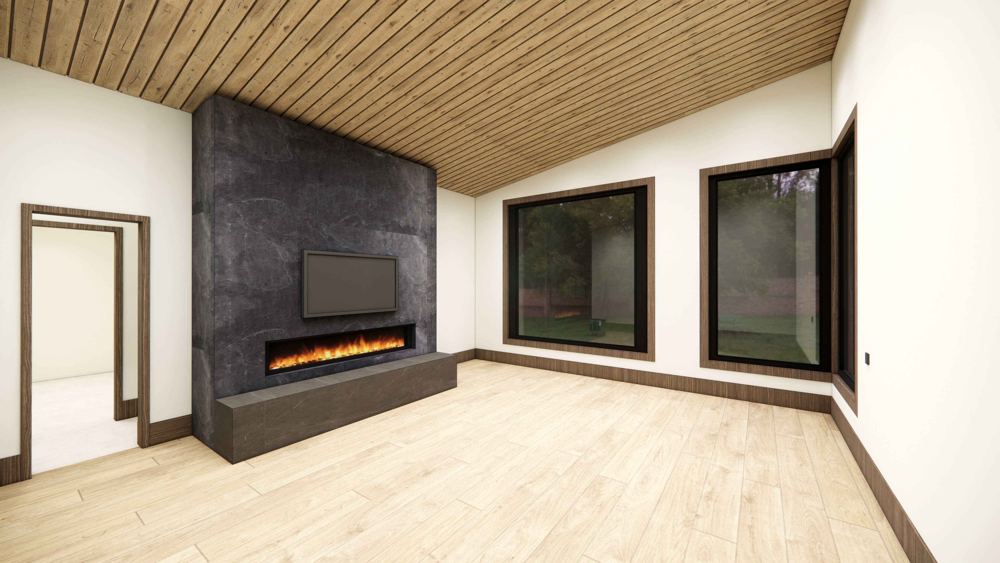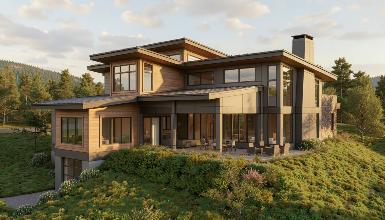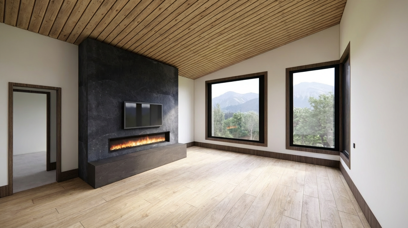 photorealistic enhancement of the provided architectural render preserve the exact architecture layout materials furniture placement and fixtures from the original image with no redesign or modifications the purpose is only to improve realism and lighting quality render as high end interior photography using a full frame camera with a 24 35mm architectural lens balanced exposure realistic dynamic range subtle depth of field and natural color grading the image should look like a professionally photographed luxury interior rather than a computer render soft natural daylight diffused window light global illumination balanced exposure do not change architecture do not change materials no redesign no new objects no additional lights no glowing fixtures no light from shower heads or faucets no dramatic shadows no surreal lighting no warped geometry no stylization the windows looking out to the exterior should be displaying mountains in the distance some trees do not darken the room the lights in the room should be on full brightness