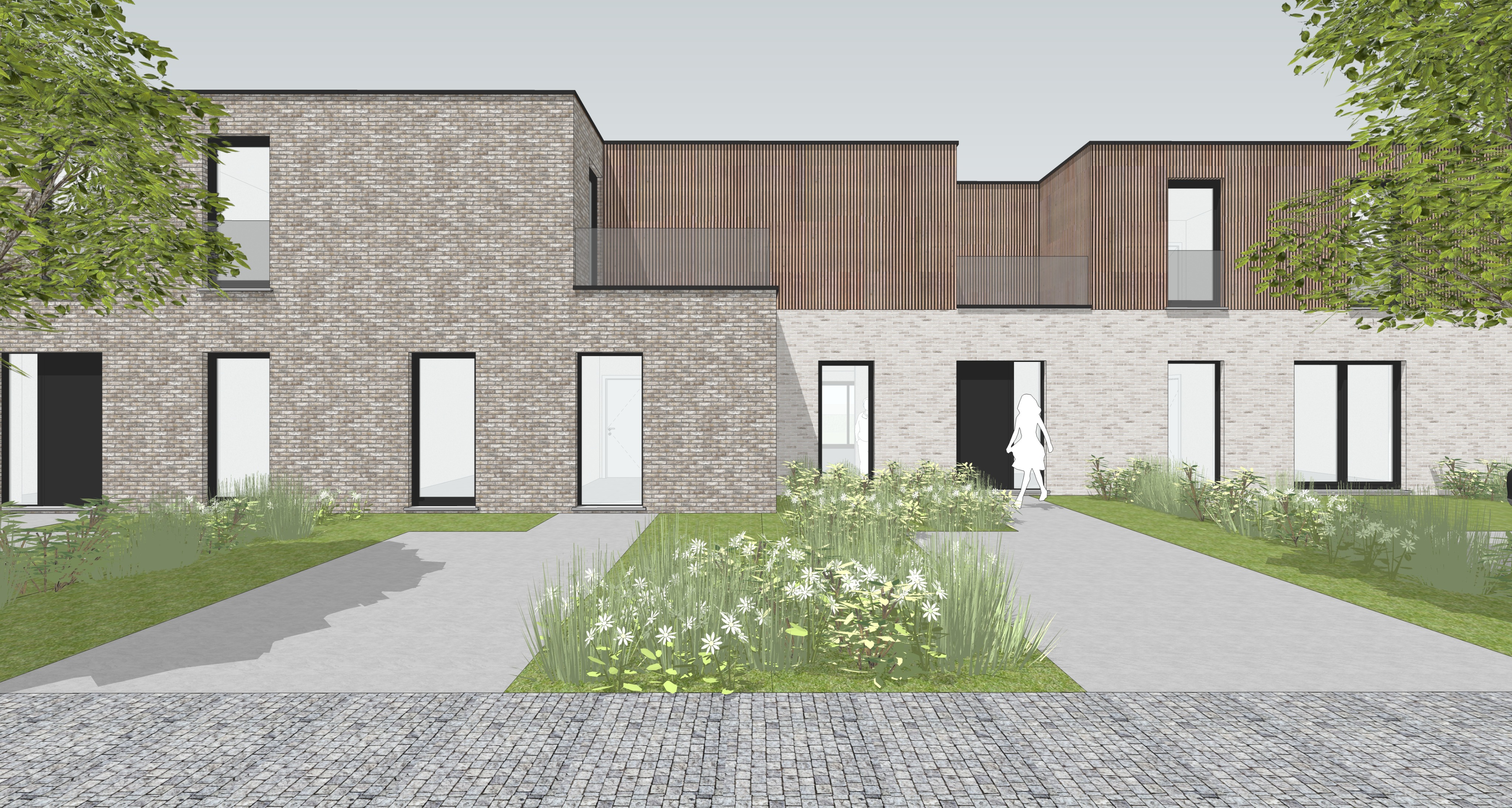 the wood needs to be a little darker the facade a little more grey instead of brown but keep the difference between the darker en the lighter facade add real people