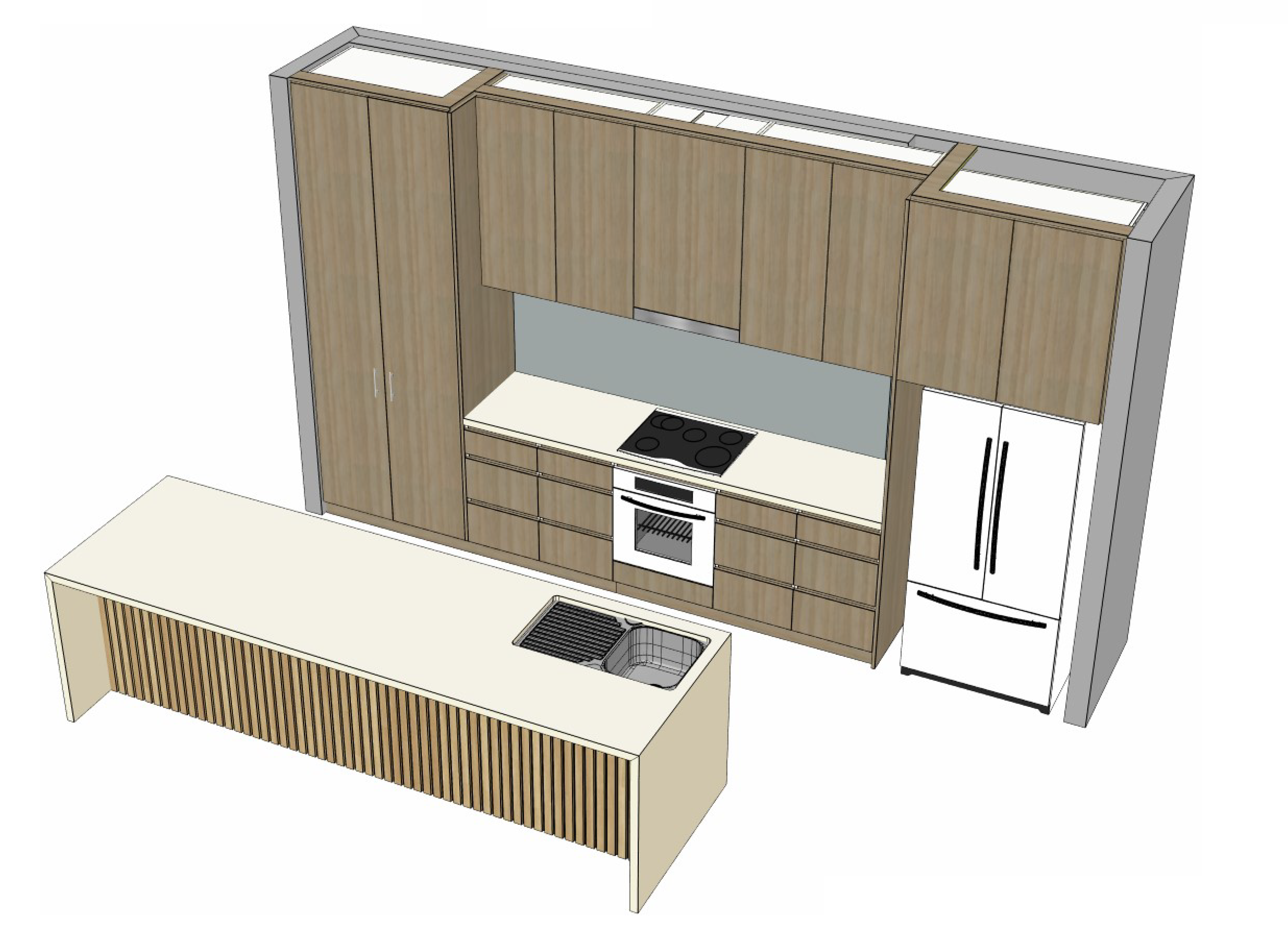 use this view to create a realistic 3d view of the kitchen which opens to the bright stylish living room gentle sunlight enters the room creating light shadows and a pleasant atmosphere add glasses plates etc to the countertop keep the colours of the kitchen materials as in the provided view take a view from the perspective of a standing person from the left to right with the living room visible in the background on the right hand side od the kitchen add two bar stools in front of the island