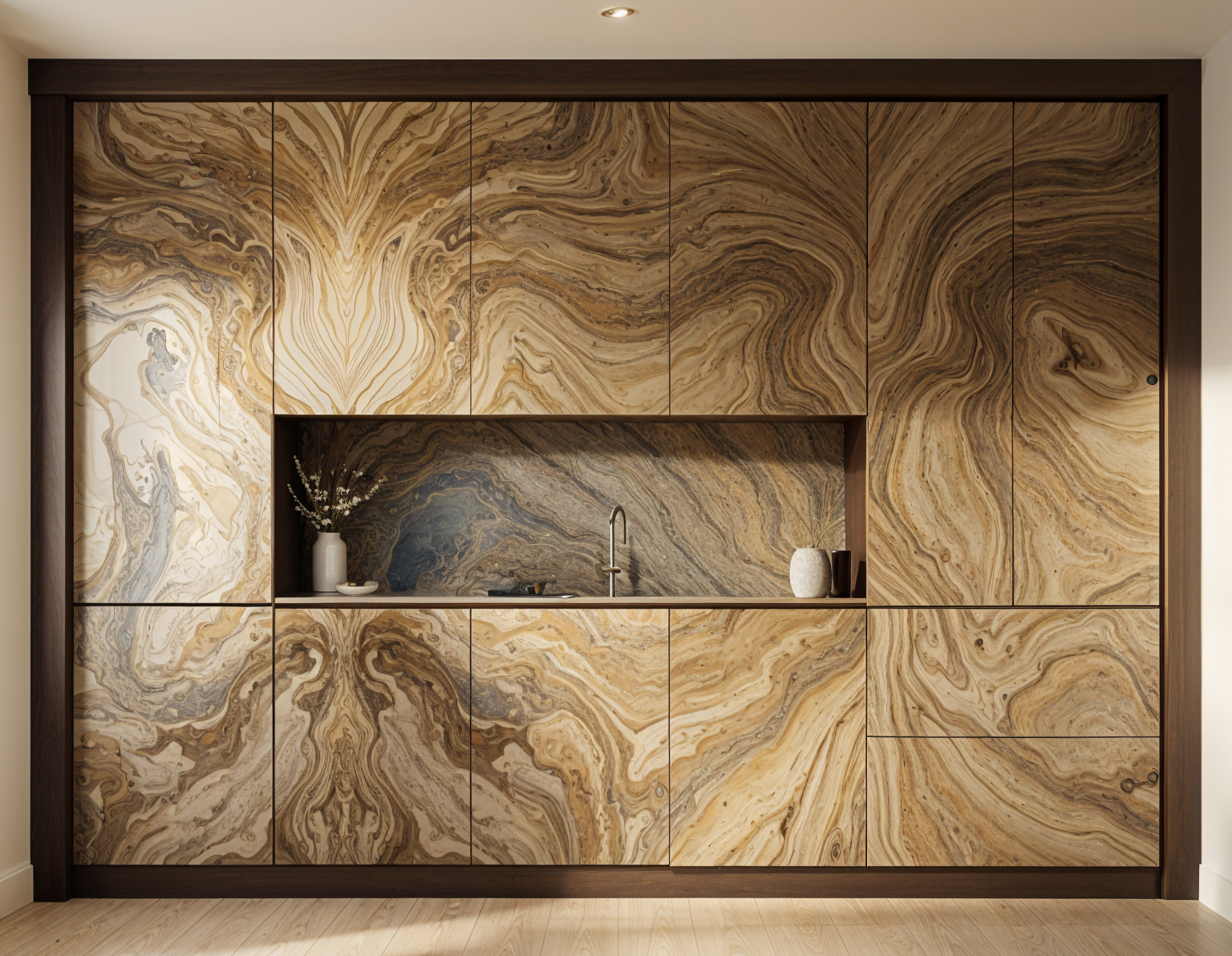 generate this burl kitchen with this stone as a back in the neache as it is in the pictuer dont change the weneer or the stone but ceap the zink int the middle as you did dont change the wood weaneer i said dont change the weneer and no faces