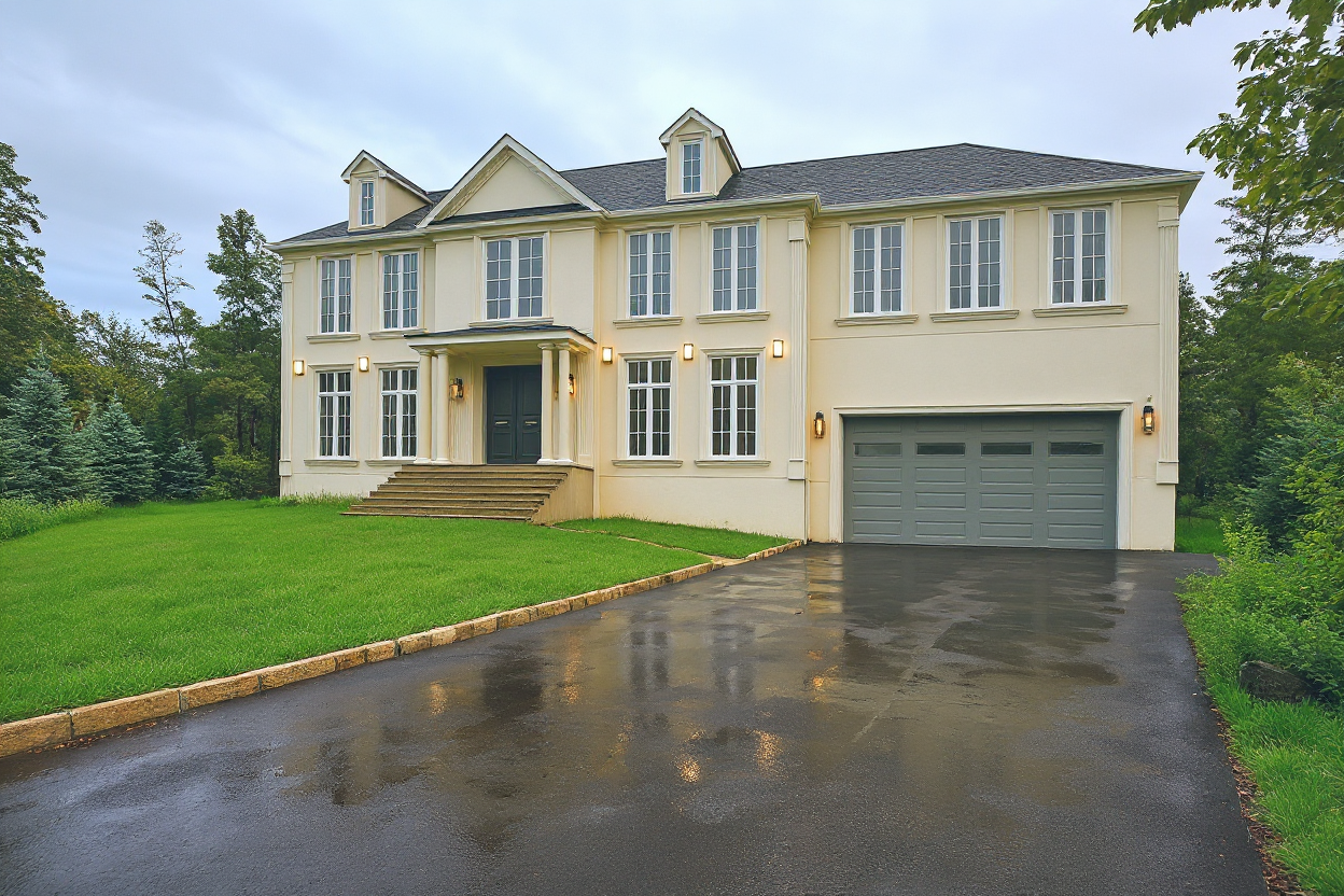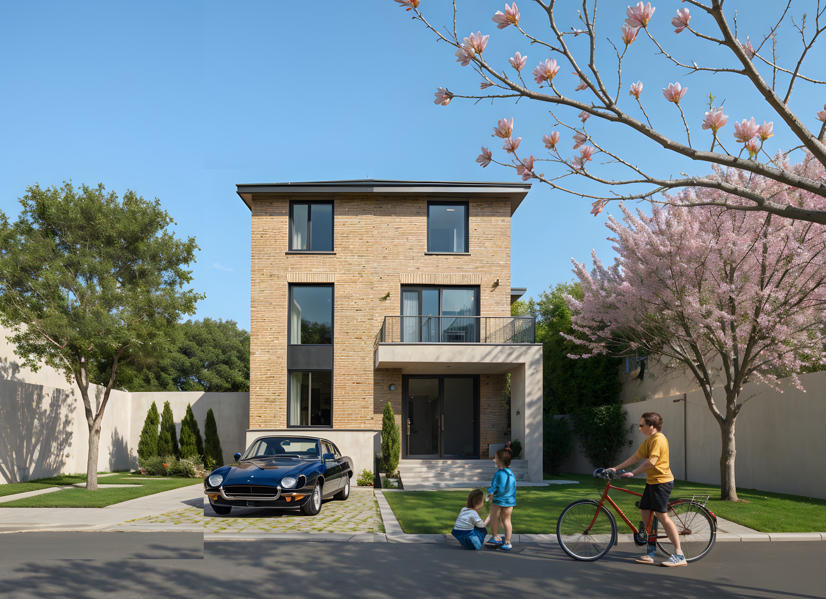 create a highly realistic rendering with toronto architecture houses beside and a car going through a side lane
