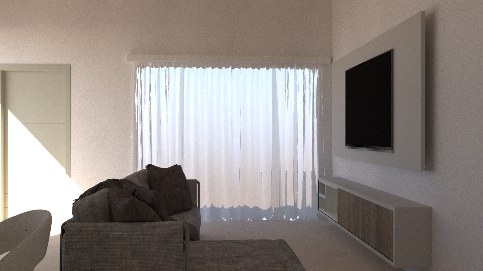 a modern living room with a minimalistic aesthetic include a sleek grey sofa with plush cushions in varying shades of charcoal and taupe the wall mounted tv is surrounded by a matte white frame below the console table features a combination of white and natural wood textures the curtains are sheer allowing soft diffused daylight to stream in the walls are painted in a soothing off white and the atmosphere is calm and serene with a slight warm glow from the sunlight filtering through the window