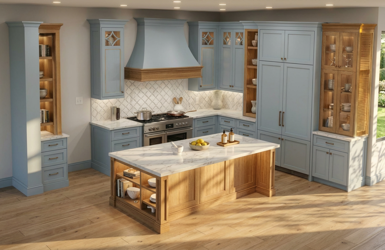 photorealistic interior render of the provided kitchen scene maintain all existing materials layout proportions and design exactly as shown do not redesign or replace any elements preserve the perimeter cabinetry as a black stained wood with visible grain matte to satin finish grain clearly readable through stain the hood vent is brushed aged copper with natural patina variation do not change material or color keep all wood tones textures and finishes consistent with the original image maintain the existing backsplash material and tone exactly as shown preserve cabinet profiles door styles hardware placement and layout keep lighting warm and natural enhancing material realism without altering color balance enhance only realistic lighting and shadows material depth and texture clarity subtle reflections and surface imperfections for realism do not change colors materials or layout add or remove design elements over modernize or stylize style high end residential natural lighting soft shadows ultra realistic materials true to life color accuracy i want to clearly see all perimeter cabinets the pocket doors on the side lead to a hallway keep it in similar color range the wood beam soffit is newly antique looking with knots in it the island is a warm medium caramel stain keep the placement of everything keep the colors make the shadows settle