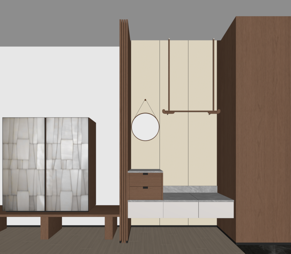 photorealistic render of a resort hotel room interior featuring two dark wood wardrobe with linens back wall and soft white walls the walls are painted a soft calming white the floor is a dark wood tone the minimalist ceiling is painted in a soft white ambient lighting is soft and inviting a contemporary minibar cabinet in mother of pearl mosic finish the atmosphere is serene and calm exuding both comfort and style