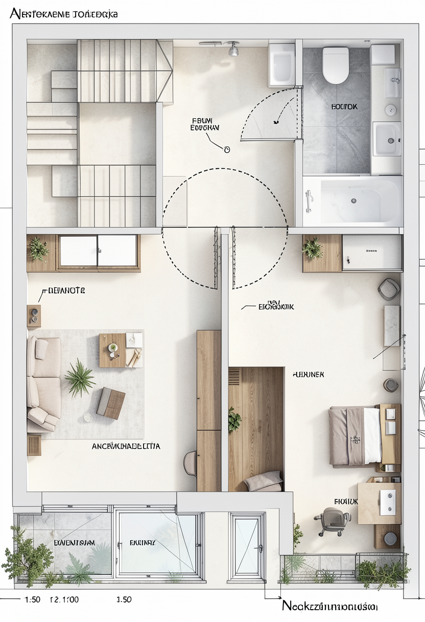 top down architectural floor plan render of a one bedroom apartment 42 sqm photorealistic 3d bird s eye view japandi scandinavian style overall color distribution 60 light clean wood tones knot free smooth grain uniform pale blonde 35 pure white surfaces 5 very subtle earthy tones on upholstery freestanding furniture and rugs only light blonde whitewashed knot free hardwood flooring with vertical planks throughout living dining and bedroom zones kitchen floor finished in smooth extra light beige microcement seamless matte pore free surface with subtle trowel texture no joints or grout lines extremely pale almost white beige bathroom floor finished in the same microcement seamless matte clear visual boundary between microcement zones and wood floor zones layout based on provided floor plan open plan space l shaped kitchen occupying the entire top left corner with induction hob 4 burners integrated sink along the left wall pure white smooth matte countertop extractor fan above hob kitchen runs along both the top wall and left wall forming a clear l shape main entrance door located at the top wall center left position shown fully closed bathroom located in the top right corner with white freestanding bathtub white toilet against the right wall white walls and microcement floor a full height built in wardrobe closet with smooth pale wood sliding doors placed along the wall adjacent to the bathroom rectangular dining table with chairs positioned in the upper center area of the main room in clean knot free very light blonde wood living area occupying the bottom left zone with an area rug off white sofa off white armchair round pale wood coffee table wall mounted tv panel on the left wall bedroom zone in the bottom right with queen size bed with white bedding headboard in clean pale wood one pale wood nightstand large glazed sliding doors balcony access along the entire bottom wall a vertical dividing line partial wall or visual separator runs from top to bottom near center separating the living zone left from the bedroom zone right as shown in the plan all doors throughout the apartment are shown fully closed no door swing arcs no open door indicators no partial openings anywhere main entrance door closed bathroom door closed all interior doors closed wardrobe sliding doors closed clean straight door lines only visible as thin gaps in the walls walls constructed from exposed cross laminated timber clt smooth knot free clean pale blonde layered wood grain on all wall surfaces no knots no dark spots no imperfections perfectly uniform light wood lamination lines only clt wall thickness visually prominent in top down view showing clean layered cross section pattern at wall ends strict color palette rule 60 smooth clean pale blonde knot free wood 35 pure white 5 ghost earthy tones on upholstery and rugs only so desaturated they are nearly white with only the faintest whisper of terracotta clay sage or olive remaining everything blends into a near monochromatic pale palette zero vivid saturated or synthetic colors anywhere lighting soft flat diffused overcast ambient lighting with no directional light source no harsh shadows no sunlight pools no light gradients across the floor uniform low intensity illumination across the entire plan only very subtle ambient occlusion beneath furniture legs under the bed frame and in wall corners shadows are extremely faint soft and barely visible no specular highlights no reflections no light bouncing overall mood calm dim evenly lit like an overcast day low brightness low contrast lighting throughout realistic material rendering smooth knot free light blonde floor texture in living and bedroom zones extra light almost white warm beige seamless matte microcement in kitchen zone very light beige seamless matte microcement in bathroom zone pale clean clt wall grain pure white smooth matte countertop fabric micro texture on sofa and rugs matte ceramic finish on toilet and tub ultra realistic high detail cgi render orthographic top down view 8k resolution