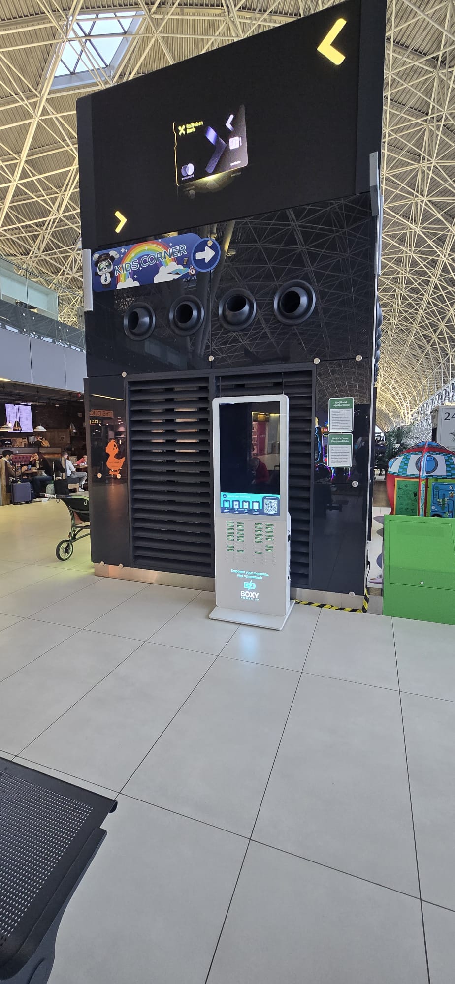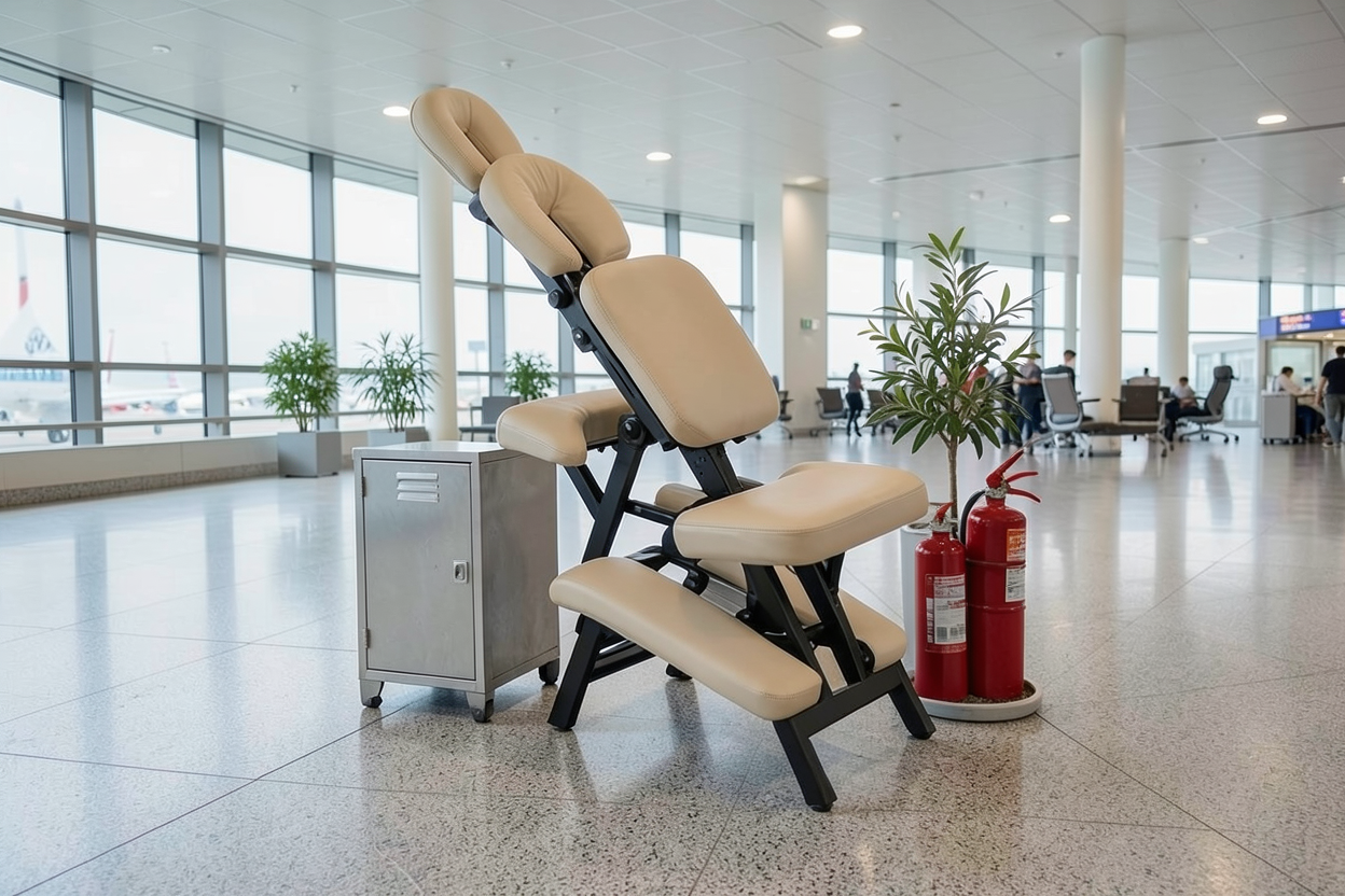 use the first image as the base airport environment insert into this exact space one massage chair based on the reference image second image one small metal cabinet next to the chair one minimal plant one fire extinguisher constraints do not change the airport environment do not add new architecture or walls do not redesign the space placement position everything naturally on the floor respect perspective and scale of the airport style realistic minimal functional important objects must look like they truly belong in this real location correct shadows and grounding no extra objects no clutter