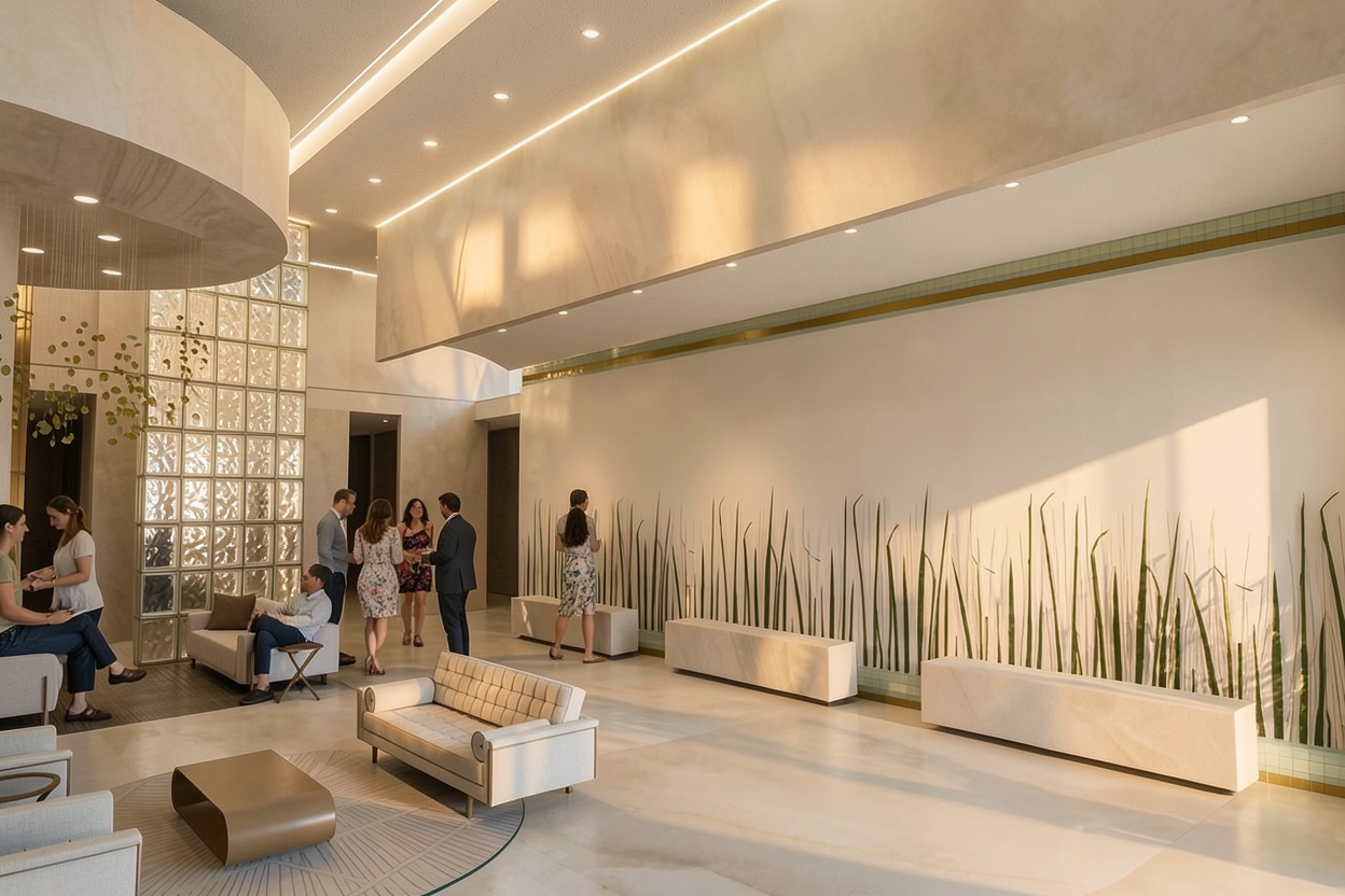 make the 3 partion ember glass blocks add people make right wall a mosaic tile