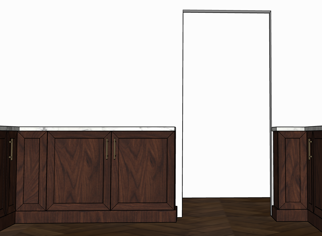 this is a beautiful walk in closet for a master bedroom the doorway is closed off with a standard interior door the cabinets are made of a natural stained knotty walnut the cabinets are all 12in deep with flush base trim along the bottom the floors are a beautiful hardwood and the countertops are white marble there are clothes hanger rods above the countertops