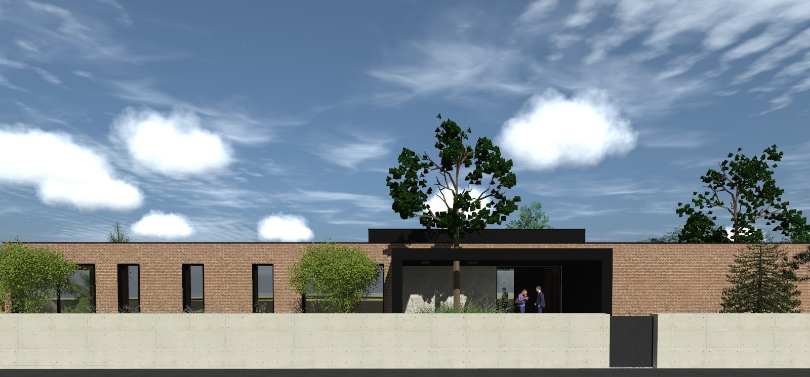 exterior shot enhance the plants enhance the trees enhance the brick texture enhance the concrete fence architecture