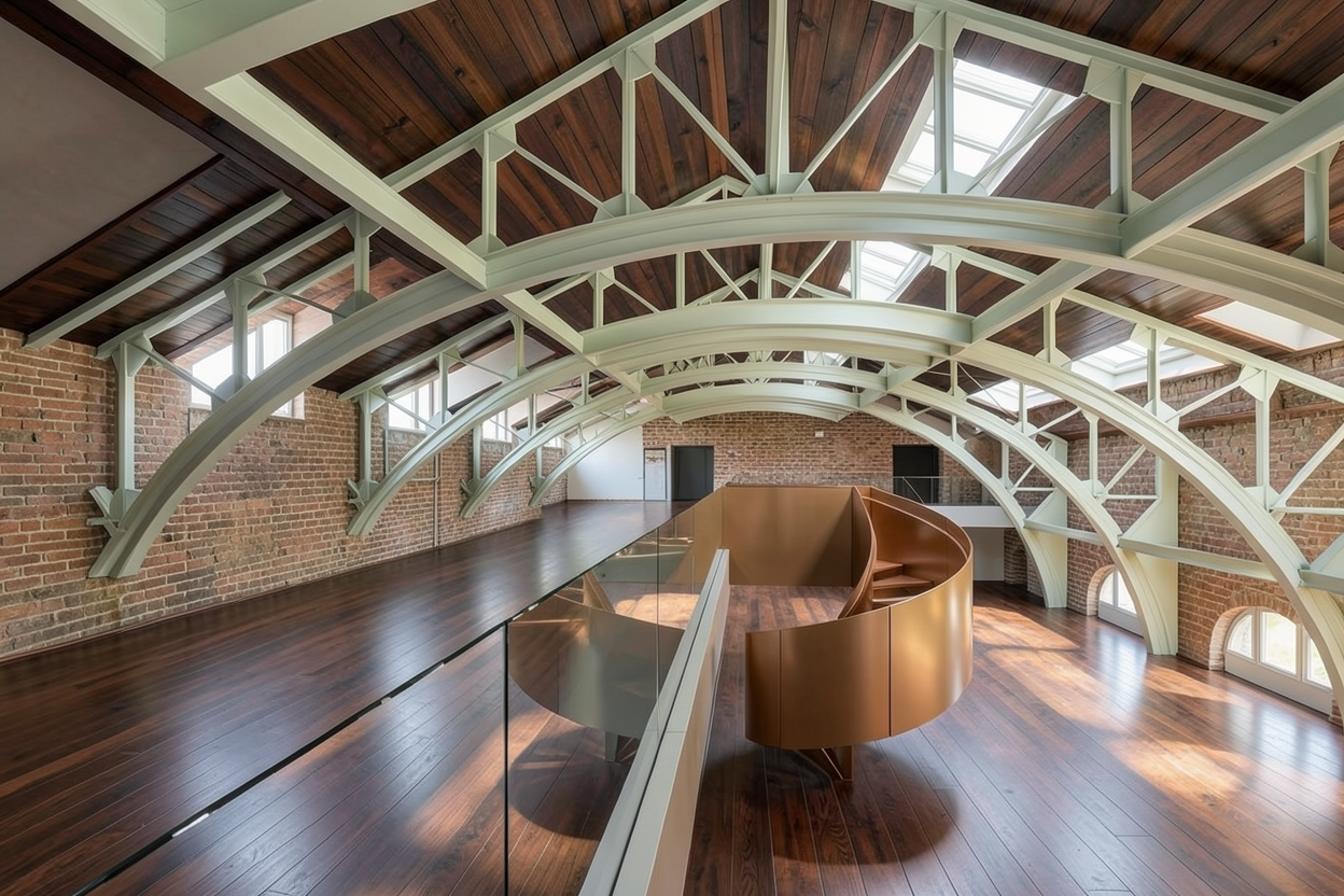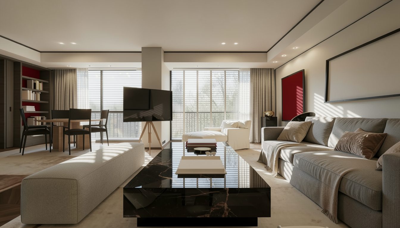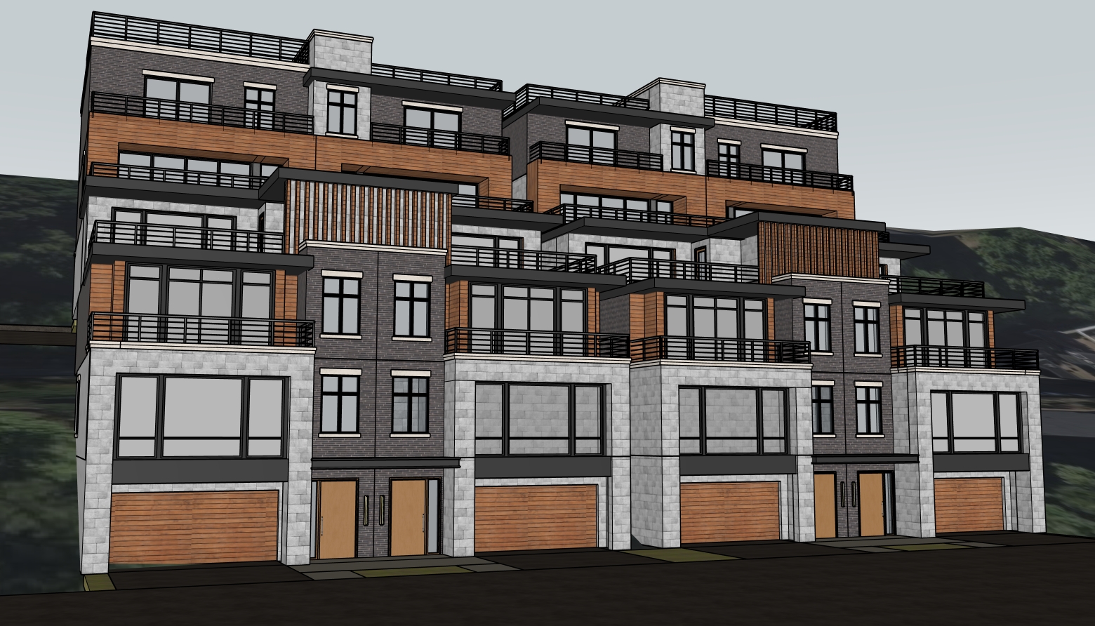 ltra photorealistic architectural rendering in a cinematic real time visualization style unreal engine d5 render quality late morning daylight with slightly angled sun creating soft defined shadows balanced exposure with no blown highlights low bloom and controlled dynamic range warm neutral color grading with subtle warm highlights and neutral shadows no blue tint natural material response with warm light reflecting off wood and ground surfaces slight contrast boost with clean crisp edges and subtle ambient occlusion clear atmosphere with no fog or haze but natural depth created through slight background softening and contrast falloff foreground and main subject remain sharp and detailed minimal curated landscaping with natural but slightly desaturated greenery no overgrown vegetation cinematic composition realistic sky with soft blue tones and light clouds professional architectural visualization style sharp focus 8k resolution lit and fully furnished interiors behind windows road with driveways to garages in foreground building built into hill looking up at building on hill with hillside historic mt adams city of cincinnati ohio in background