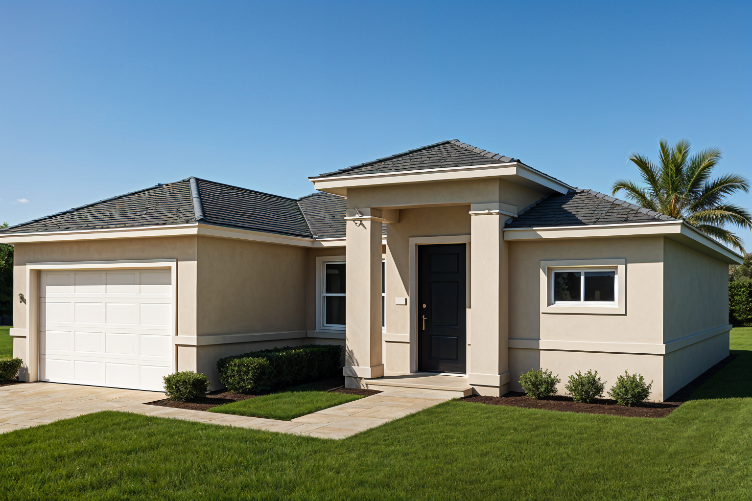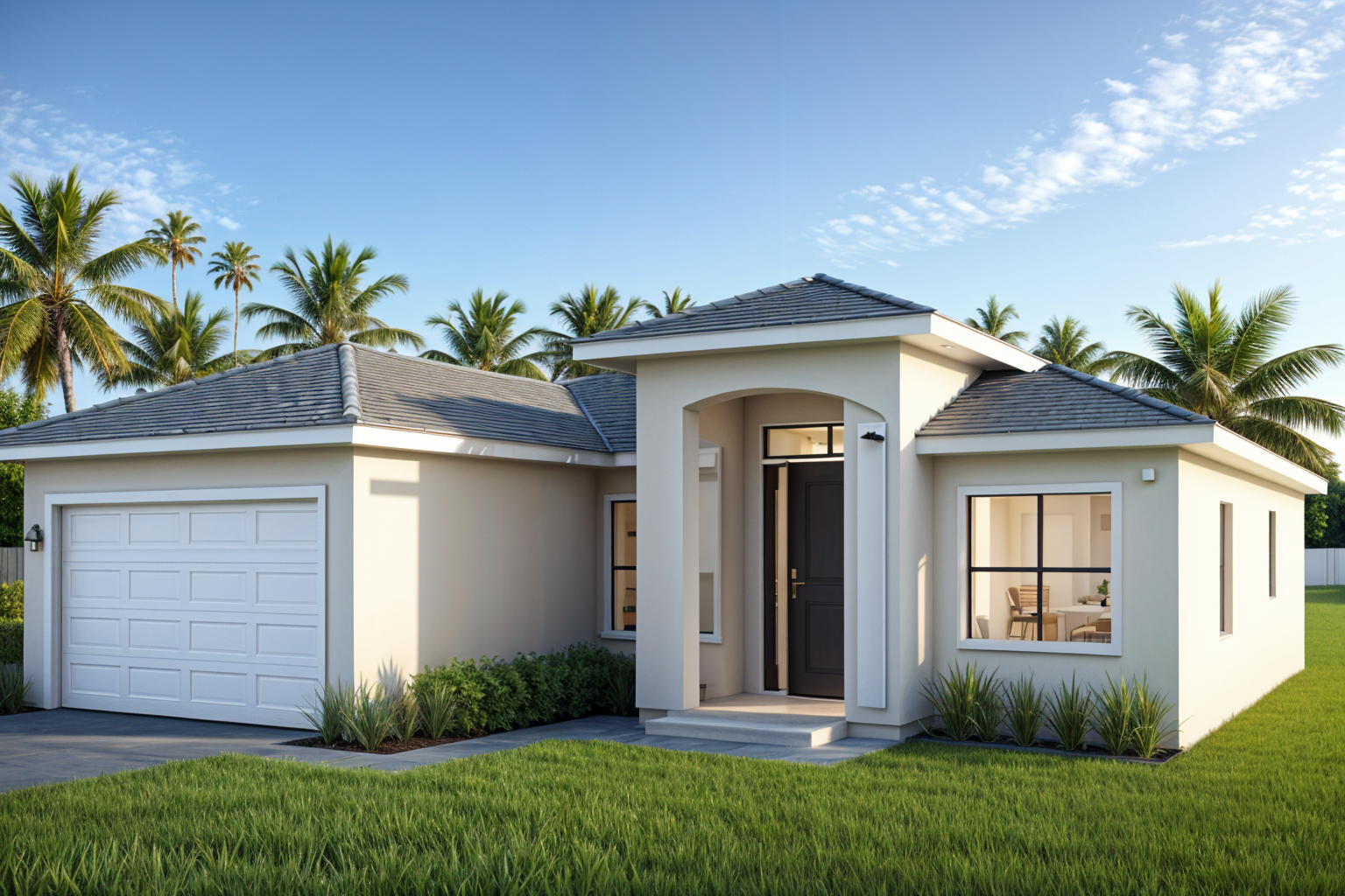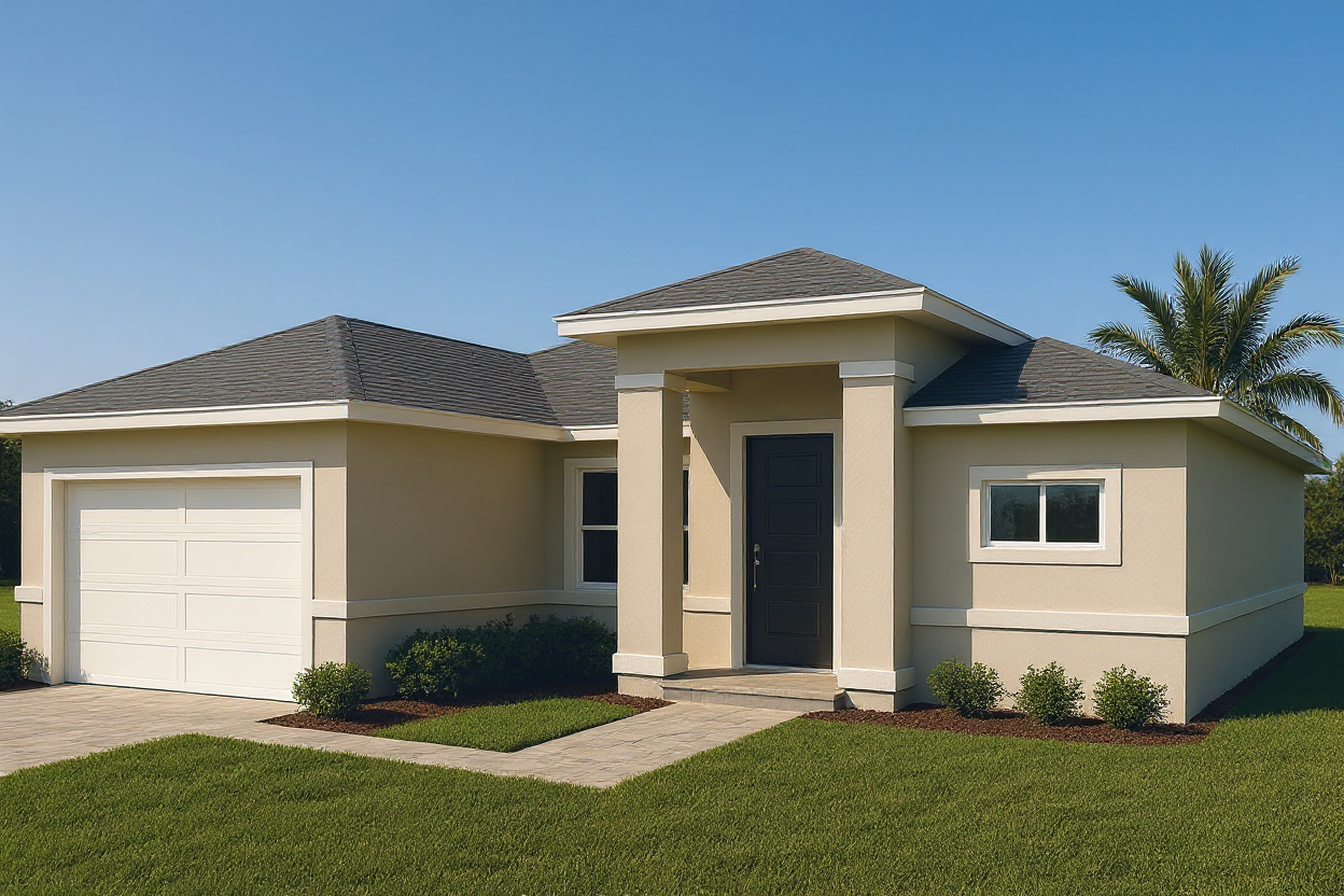 generate a photorealistic render of the same modern florida style single story house as in the reference image the architecture materials and lighting must match exactly the previous render camera and composition set the camera at eye level 1 6 meters height use a slight frontal perspective showing the full front fa ade including the garage door on the left and the right side wall the camera should be centered but slightly offset to the right just enough to show fa ade depth maintain balanced proportions and no cropping on either side of the house architecture and materials smooth light beige stucco exterior walls white trims fascia and base moldings medium gray architectural shingle roof with clean lines and soft reflections charcoal gray modern front door with horizontal panels white flat panel garage door white aluminum window frames with clear reflective glass light gray paver driveway and entry walkway green grass lawn and trimmed shrubs along the base one palm tree visible in the background for florida context lighting and environment bright warm afternoon sunlight around 4 00 pm casting soft shadows toward the right clear blue sky no clouds natural reflections and contrast similar to high end architectural photography maintain the same realistic tone depth and color balance as the reference image framing and render style use a 28 35 mm wide angle lens equivalent for realistic architectural perspective photorealistic render with smooth global illumination soft ambient occlusion and sharp material definition do not exaggerate reflections or contrast keep natural lighting realism