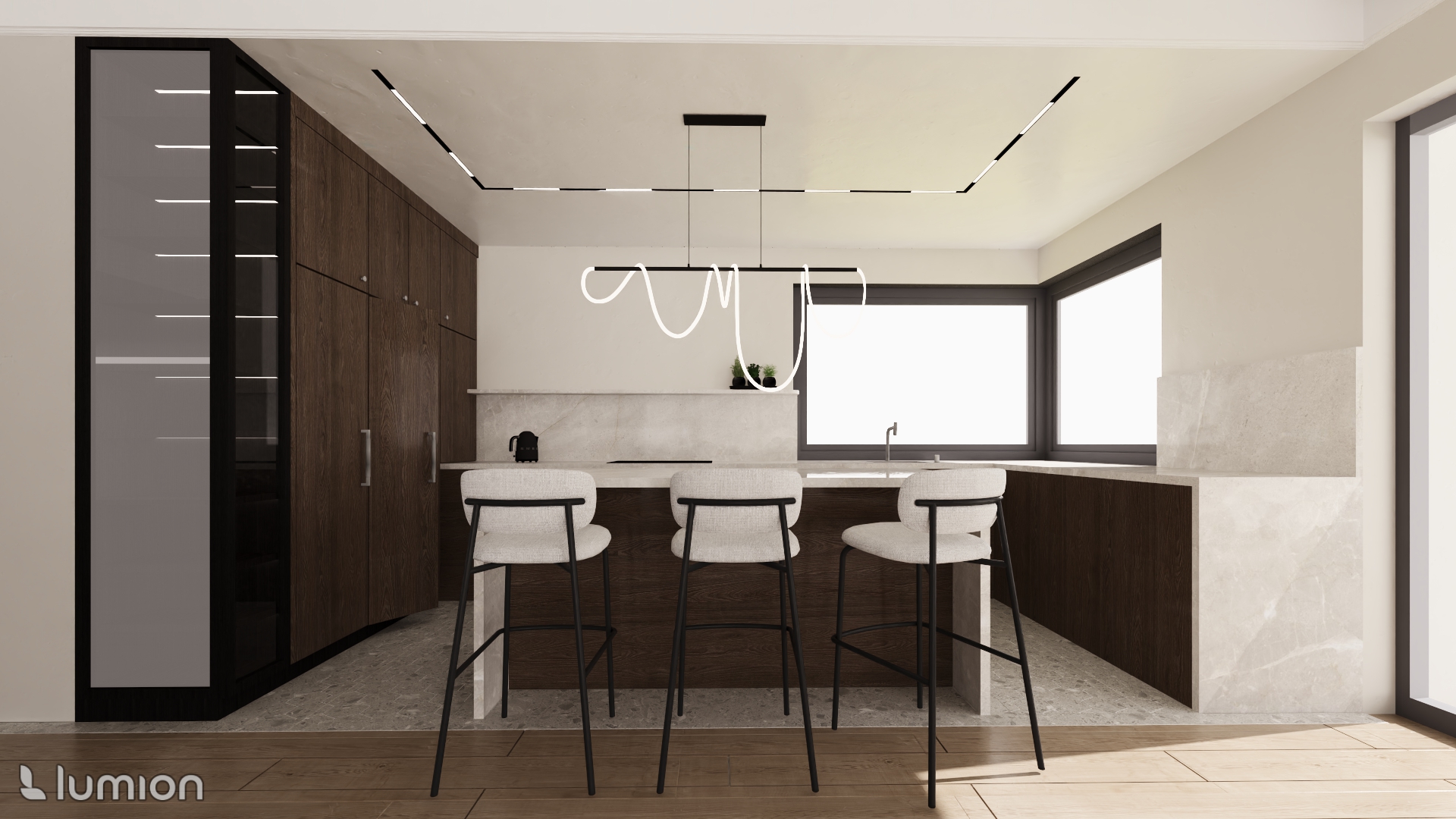 copy prompt improve the visual quality of this architectural render by enhancing lighting realism shadow accuracy reflections and global illumination while strictly preserving the original architectural design do not modify geometry structure proportions materials layout or architectural elements increase photorealism through natural light behavior soft shadow transitions accurate ambient occlusion realistic reflections on glass and metal and subtle surface imperfections maintain true to life scale and material response improve sharpness depth and dynamic range for a high end professional architectural visualization look and do not redesign or alter the architecture do not change materials into different ones do not add or remove objects do not modify proportions structure or layout no stylistic reinterpretation no futuristic or fantasy elements remove the text from the left side zr b kolory ja niejsze kolory make color mooore brightly rwmove something outside make white color add some kitchen accesories