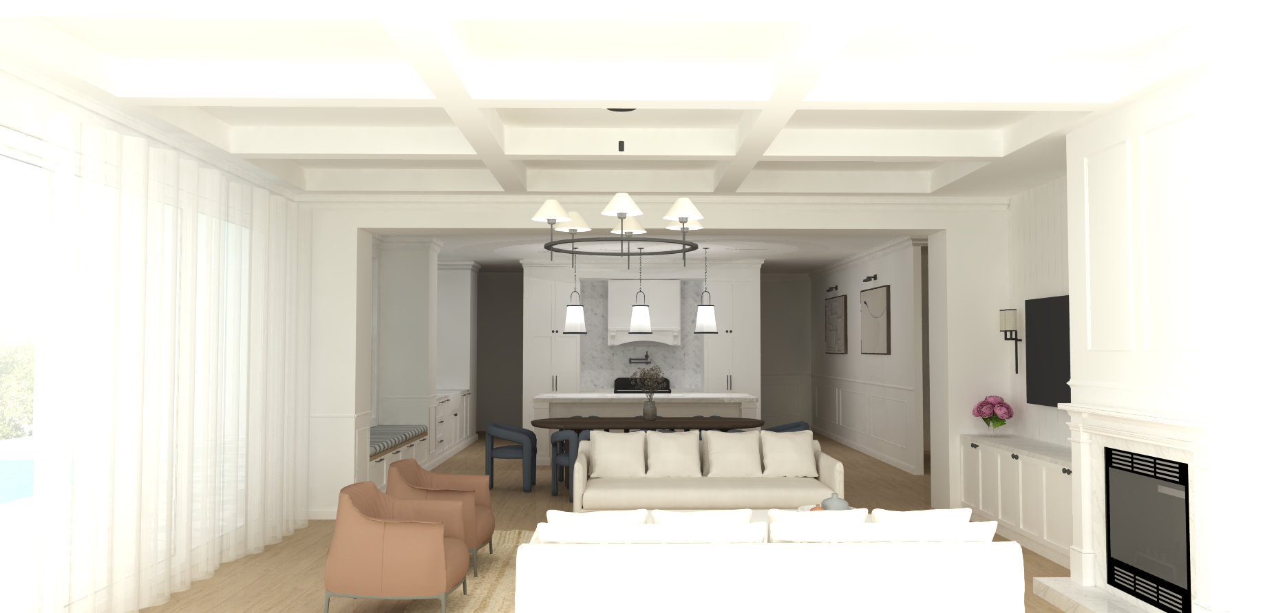 create realistic image all cabinetry in white bench tops in carrara marble carrara marble mosaic splash back in kitchen fireplace to be lit