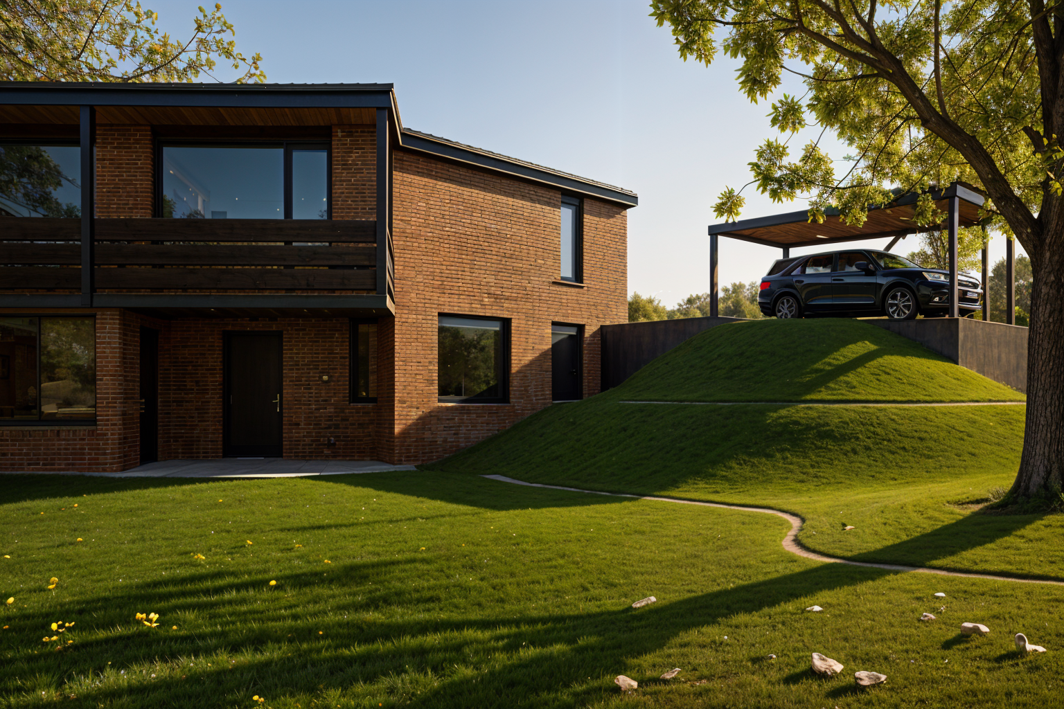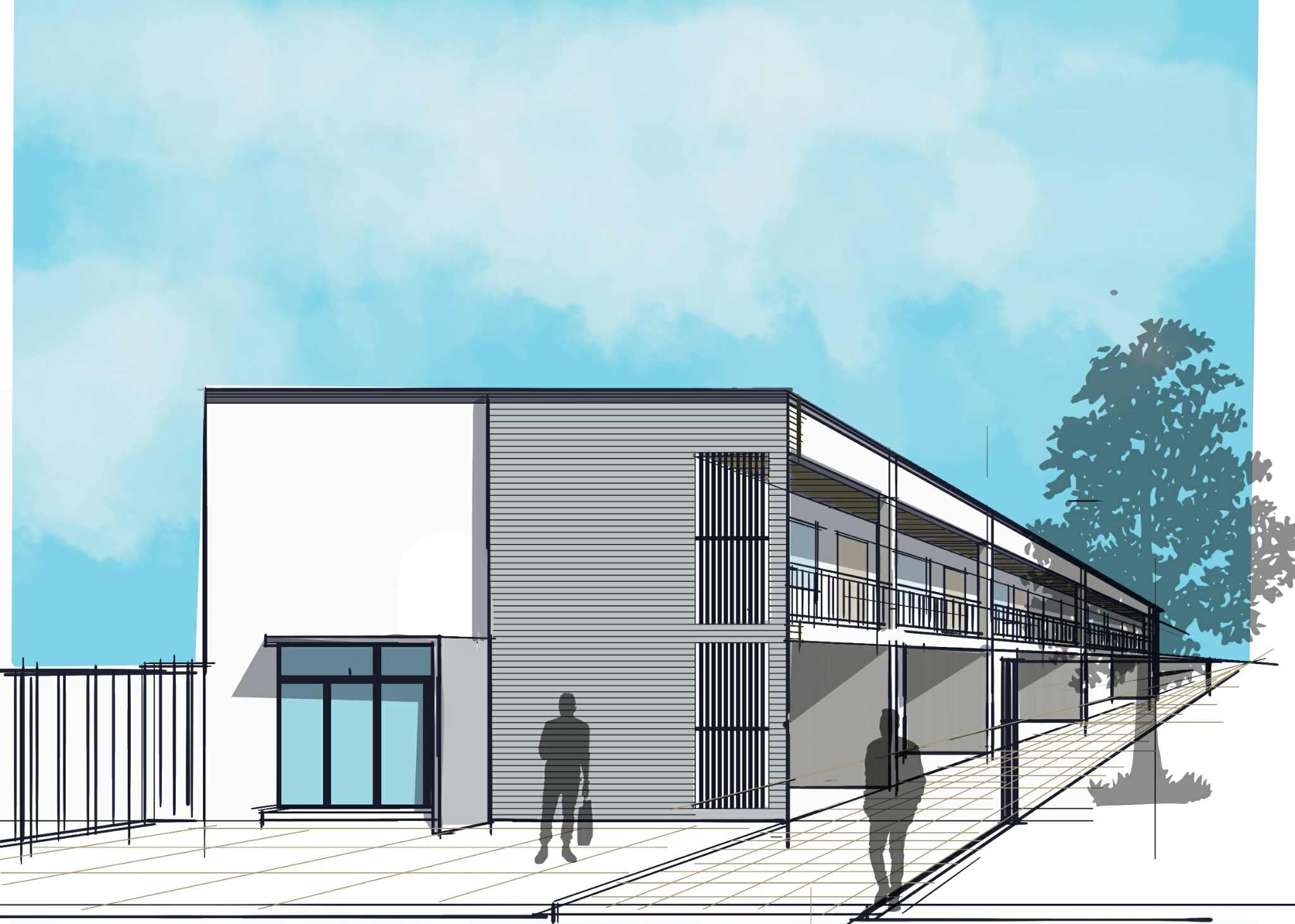 ultra realistic 3d render of a modern two story apartment with floor to ceiling glass windows flat concrete roof and wood panel ceiling commercial space laundry area in front parking area in front of the structure rendered in cinematic lighting with soft shadows high detail textures 8k resolution architectural visualization style