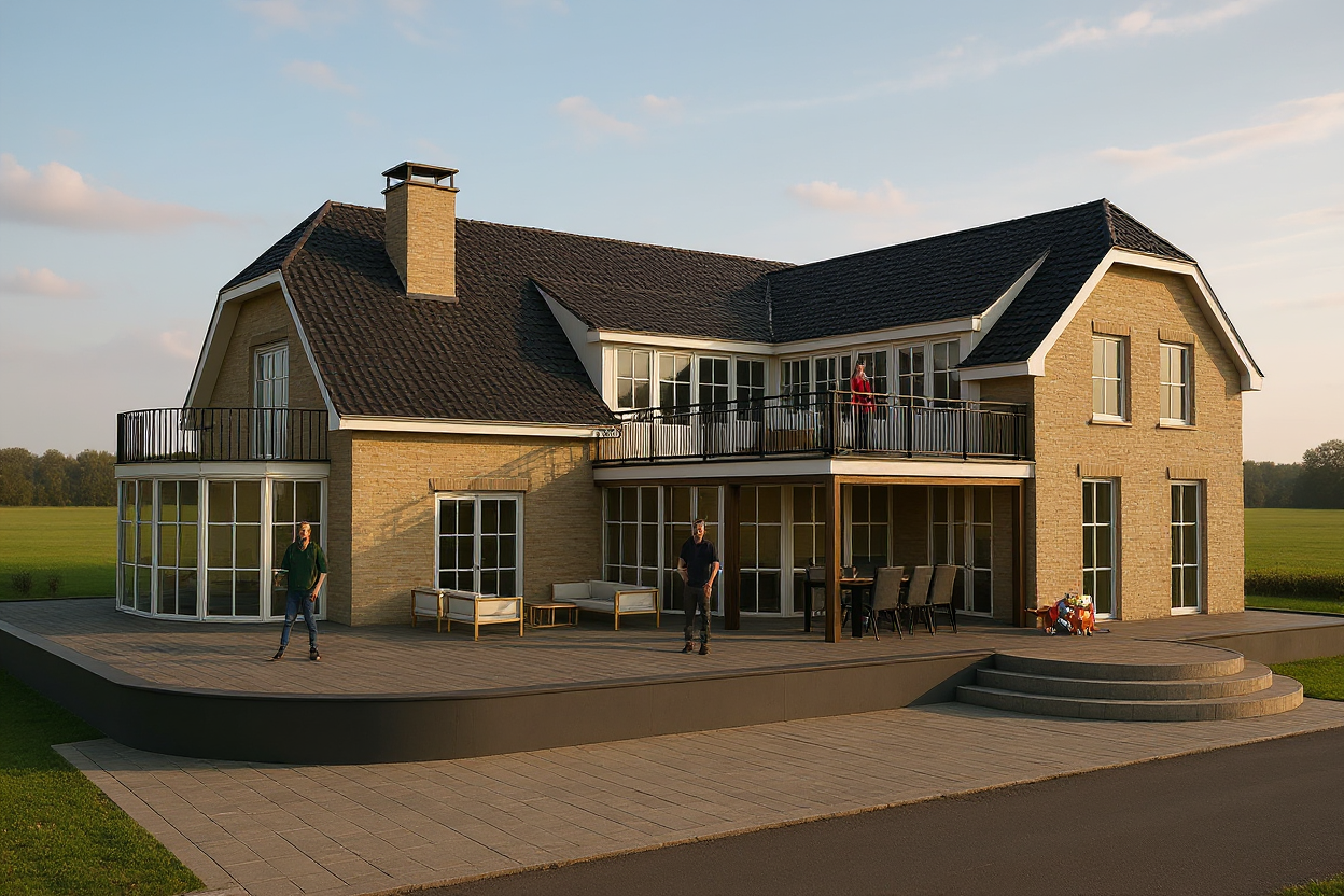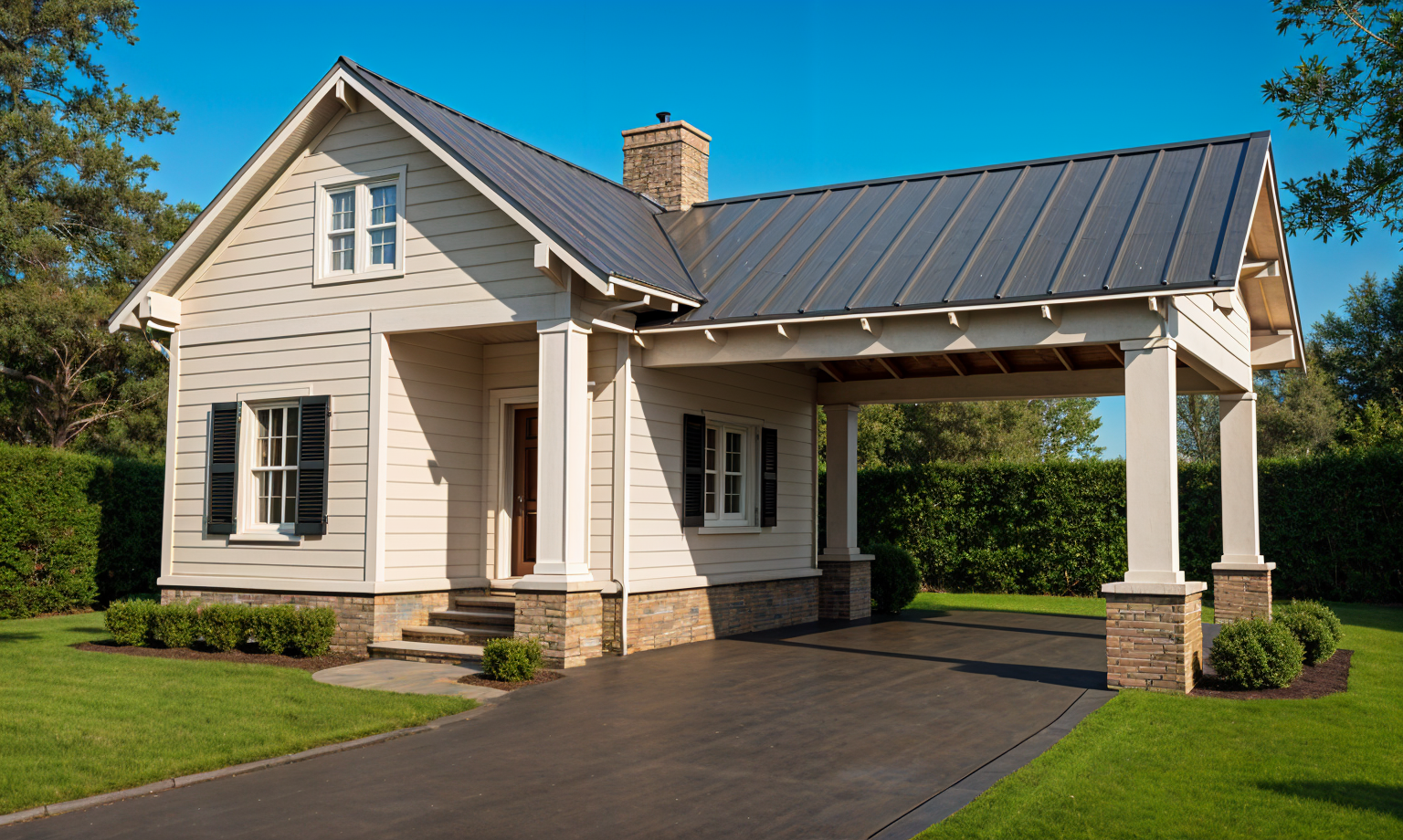 generate a beautifully rendered image of an edge of an open air porte cochere and a garage door next to a wall with a dutch door with a light oyster fa ade featuring light navy blue window shutters columns have brick bases the roof is dark gray shingles has many exposed rafter ends and exposed rafters underneath and the frames around the windows and doors are crisp white surround the home with driveway and some brick pavers the sky is a clear bright blue creating a warm and inviting atmosphere the scene should be rendered with soft lighting capturing the tranquil ambiance of a peaceful suburban setting