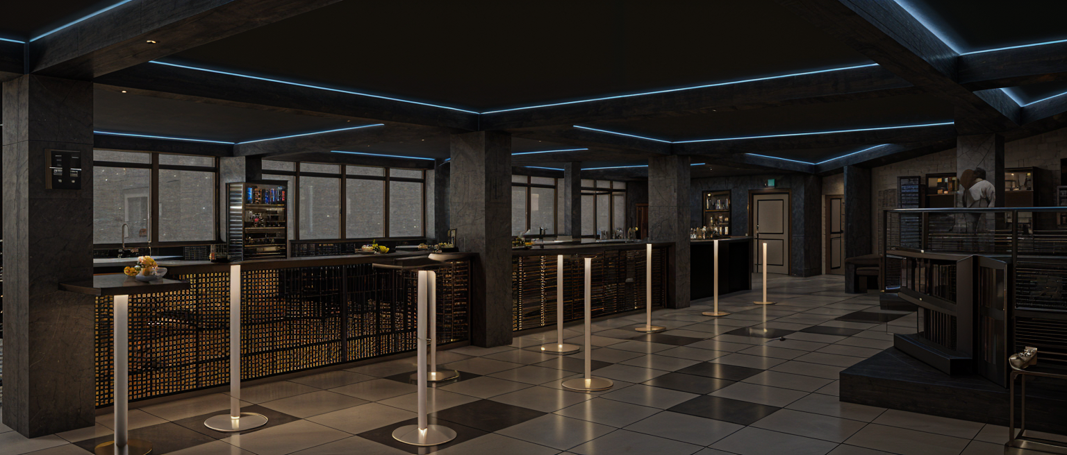 render a bar maintain the photo dont add some additional furnitures cove ceilings with led lights based on the picture industrial interior design night scene with brighter output