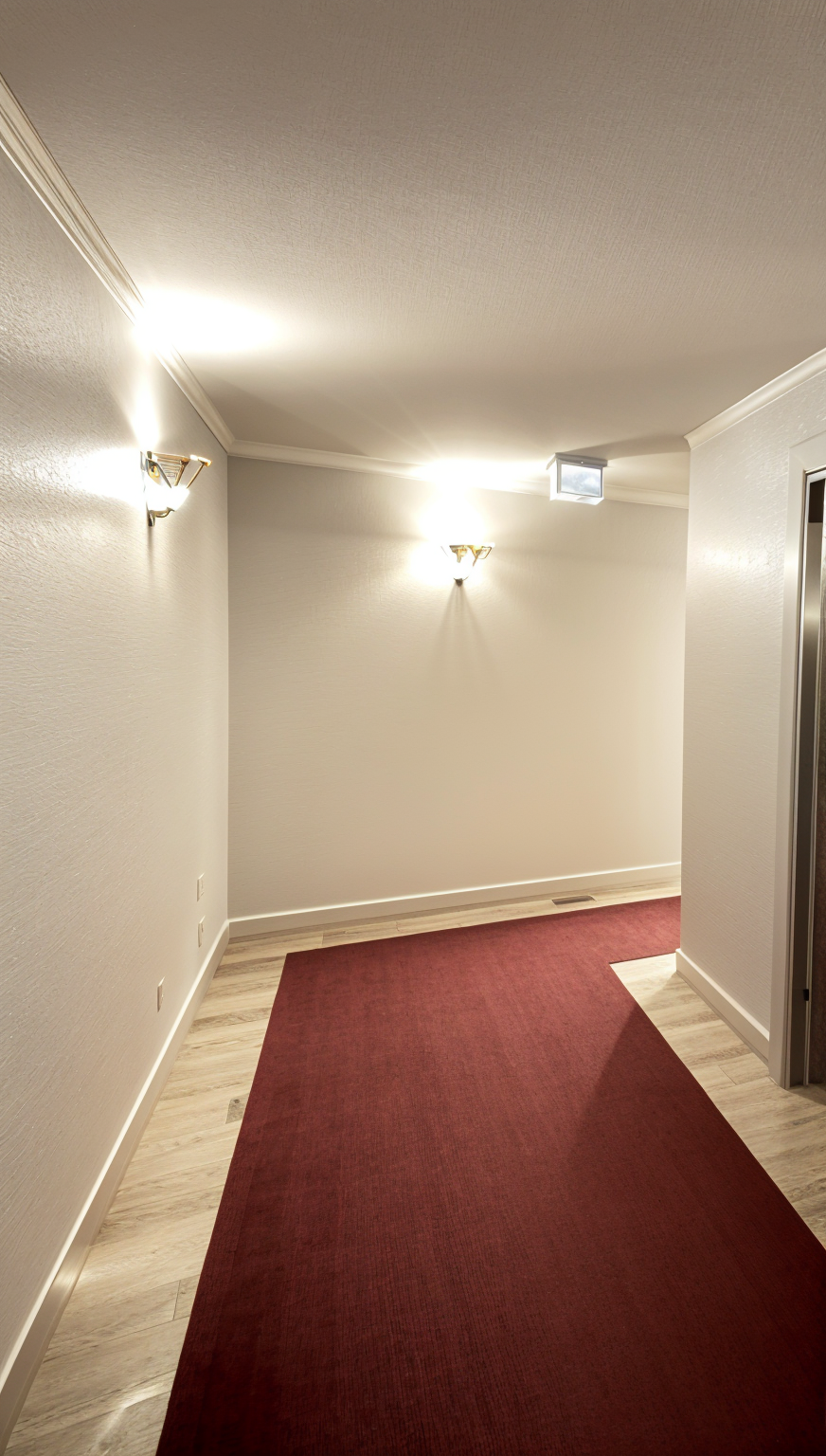 change walls to bright white textured wall covering change carpet to deep cherry red ceiling to be cherry red like carpet install deep cherry red horizontal stripe under a cornice at ceiling new wall sconces with warm light architecture