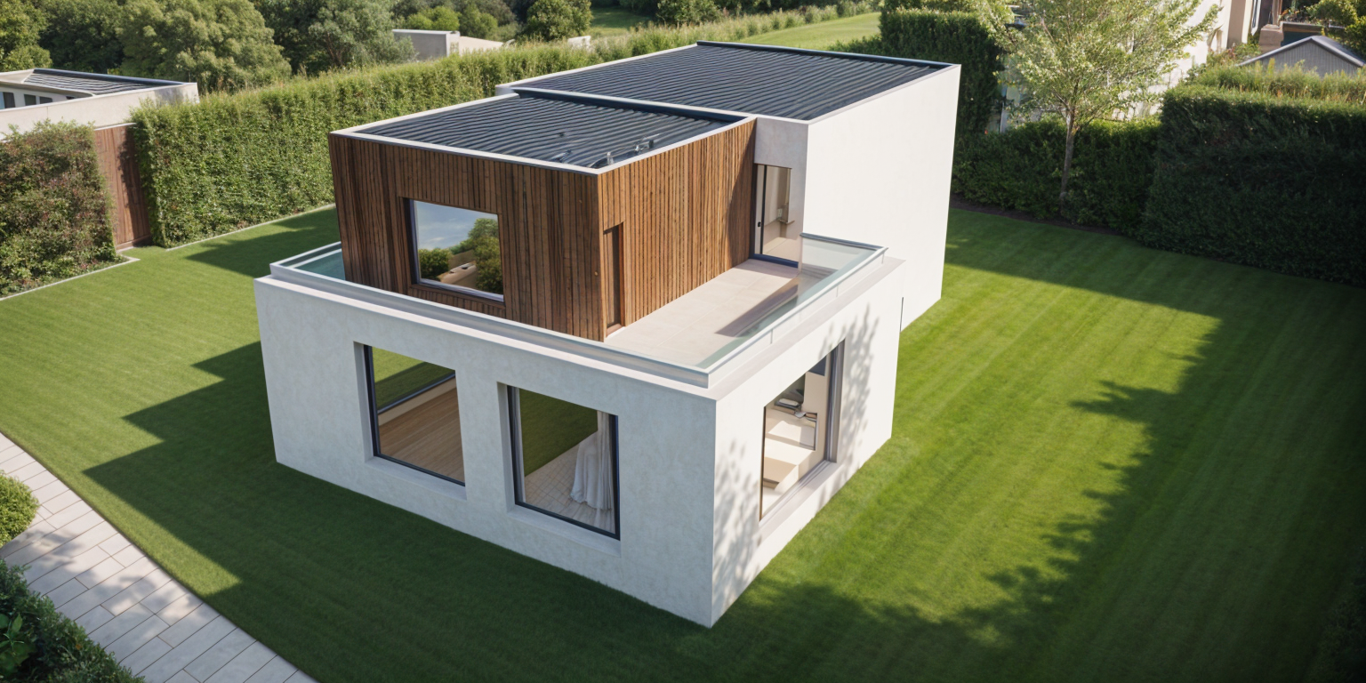 modernist exterior shot please add garden with trees and bushes around the house during the summer in northen europe grass on the ground around the house please add roof to to the second floor summer terracce what covers 80 of the terrace solar panels cover all roof change the view point higher so that second floor terracce is visible architecture