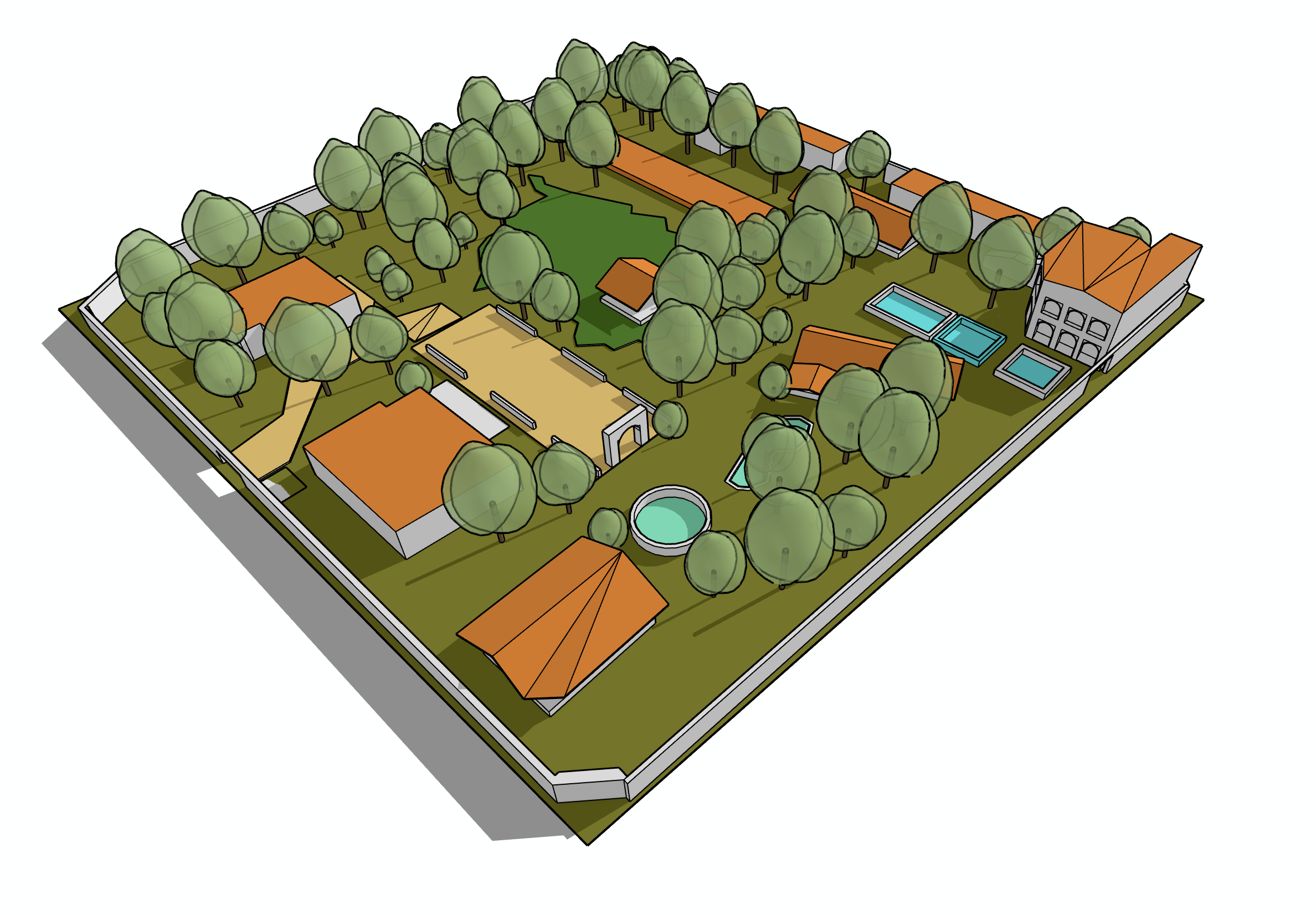 exterior shot aerial view of a lush idyllic estate surrounded by vibrant greenery the rooftops are a rich terracotta orange contrasting beautifully with the fresh leafy green of the trees the buildings are painted in elegant shades of beige while the clear inviting swimming pools shimmer in bright turquoise the gentle sunlight casts soft shadows creating a serene and peaceful atmosphere the estate is enclosed by a pale gray stone wall blending harmoniously with the landscape surround the scene with a tranquil sunny ambiance