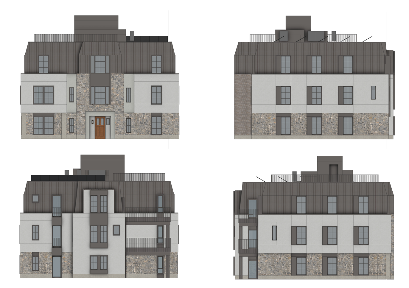 make this simpler with stone for 2 floors on the front and 1 side for about 66 of the front and 1 side and the rest of floors 1 and 2 lap siding and floor 3 leave as is