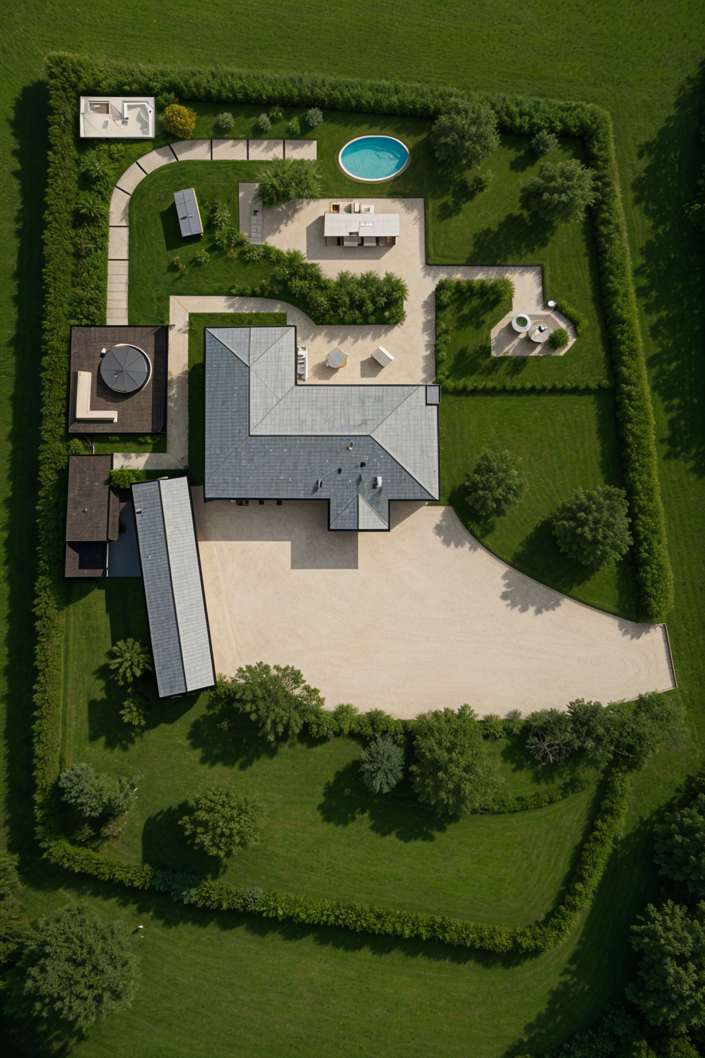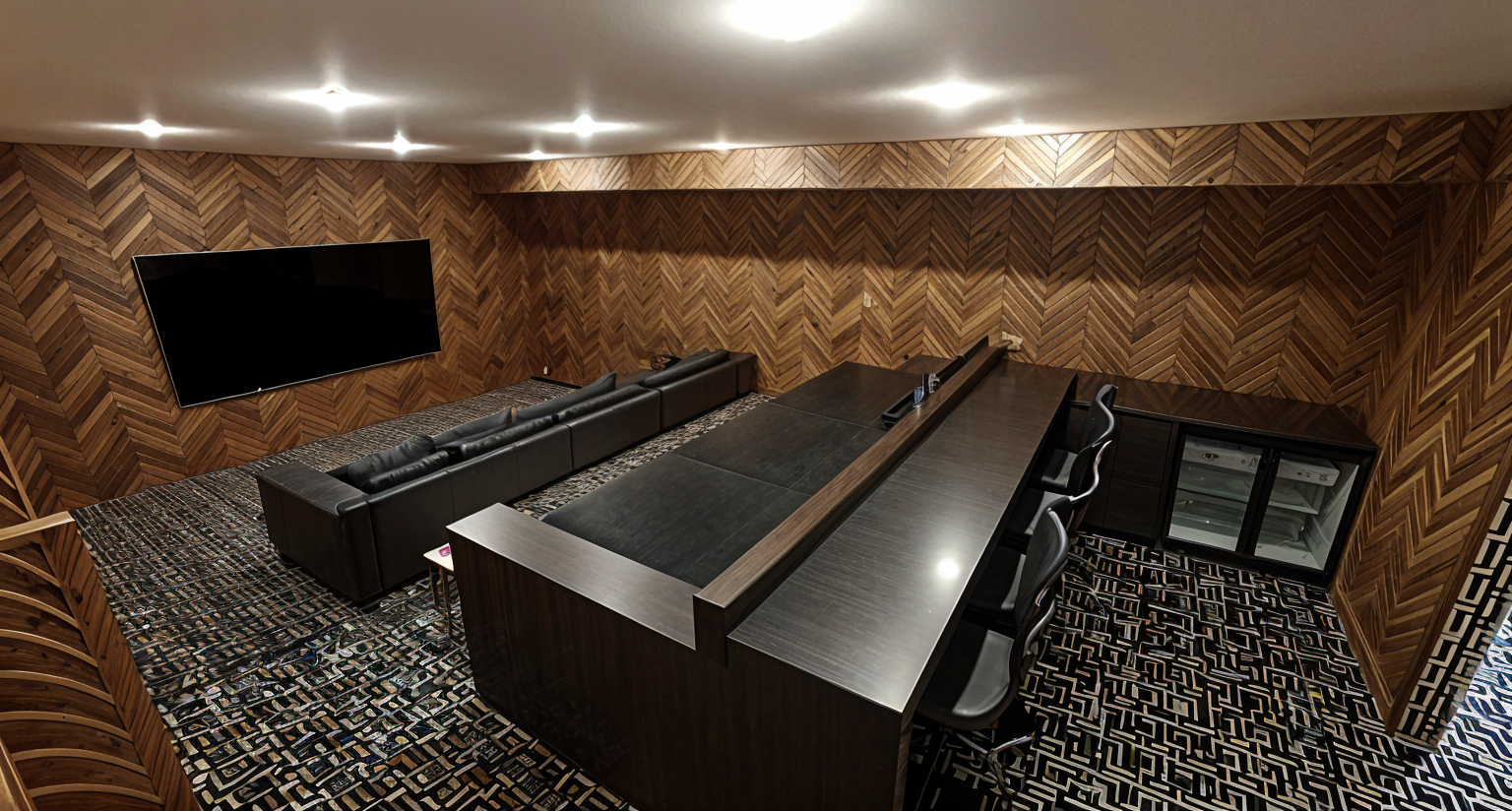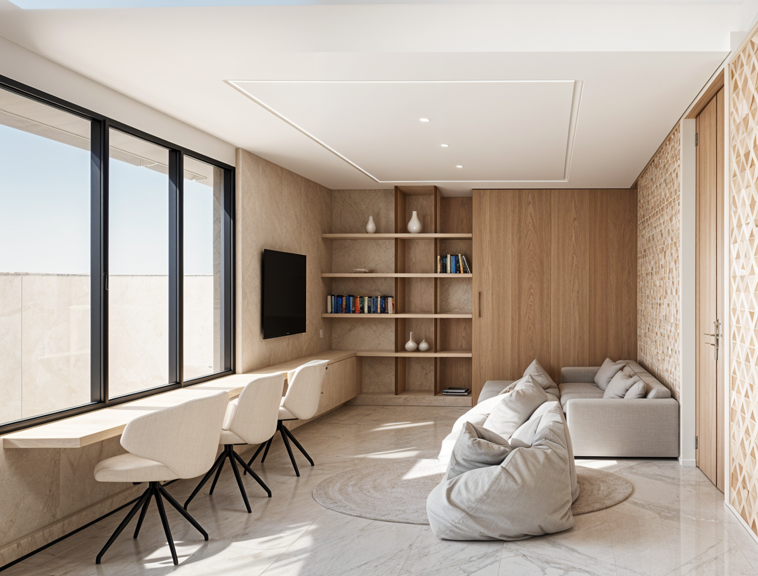 modern study and lounge interior render with a calm sophisticated atmosphere large windows along the left wall black slim profile frames and diffused natural daylight with a view of the perimeter wall and a piece of a light blue realistic sky above the perimeter wall long built in desk with a beige travertine surface and three upholstered swivel chairs in soft cream fabric at the back a minimalist shelving horizontal divisions in beige travertine vertical divisions in light wood unit in light wood with decor pieces and books adjacent to a wall mounted tv with also a light wood back piece a contemporary modular sofa in neutral gray stands on the right paired with two relaxed beanbag over a round gray rug silver marble flooring warm wood panel accent wall and a recessed white ceiling with indirect lighting and small downlights finally a right wall in light beige paint and a light wood door clean lines soft neutral palette photorealistic textures and a refined serene architectural visualization style
